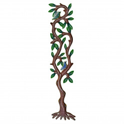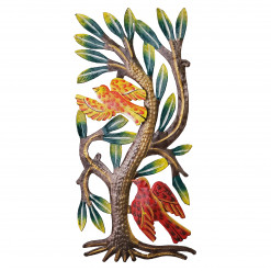 The 4.75" x 10.5" Vertical Painted 2 Birds in Tree is hand-chiseled out of recycled steel oil drums by Haitian artisans.