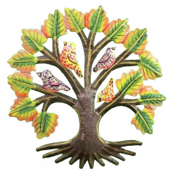 The 11" x 5" Horizontal Painted 2 Birds in Tree is hand-chiseled out of recycled steel oil drums by Haitian artisans.