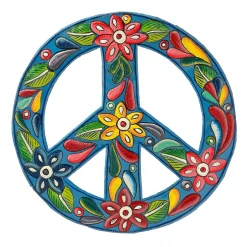 The 12.5" Painted Blue Floral Peace Sign is hand-chiseled out of recycled steel oil drums by Haitian artisans.