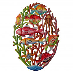 The 14.75" x 21.5" Painted Tropical Marine is hand-chiseled out of recycled steel oil drums by Haitian artisans.