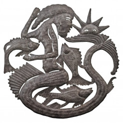 The 18" Mermaid & Fish is hand-chiseled out of recycled steel oil drums by Haitian artisans.
