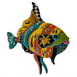 The 14.75" x 17.5" Large Painted Tropical Fish is hand-chiseled out of recycled steel oil drums by Haitian artisans.
