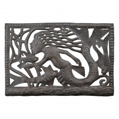 The 12" x 8" Rect Mermaid with 3 Fish is hand-chiseled out of recycled steel oil drums by Haitian artisans.