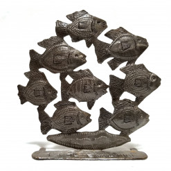 The 4.5" Freestanding Tropical School of Fish is hand-chiseled out of recycled steel oil drums by Haitian artisans.