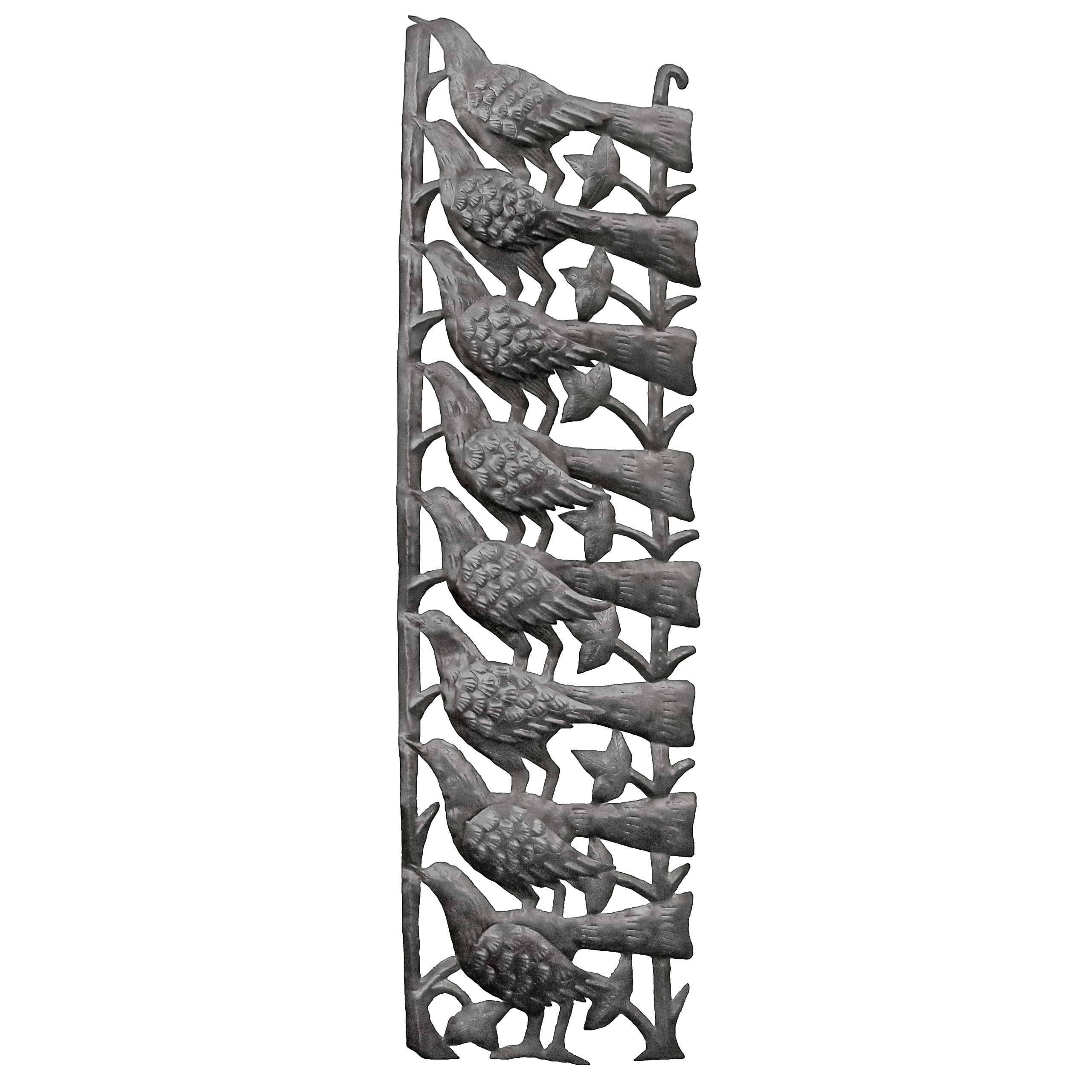 The 11.5" x 7" 4 Birds with 3D Wing Door Topper is hand-chiseled out of recycled steel oil drums by Haitian artisans.