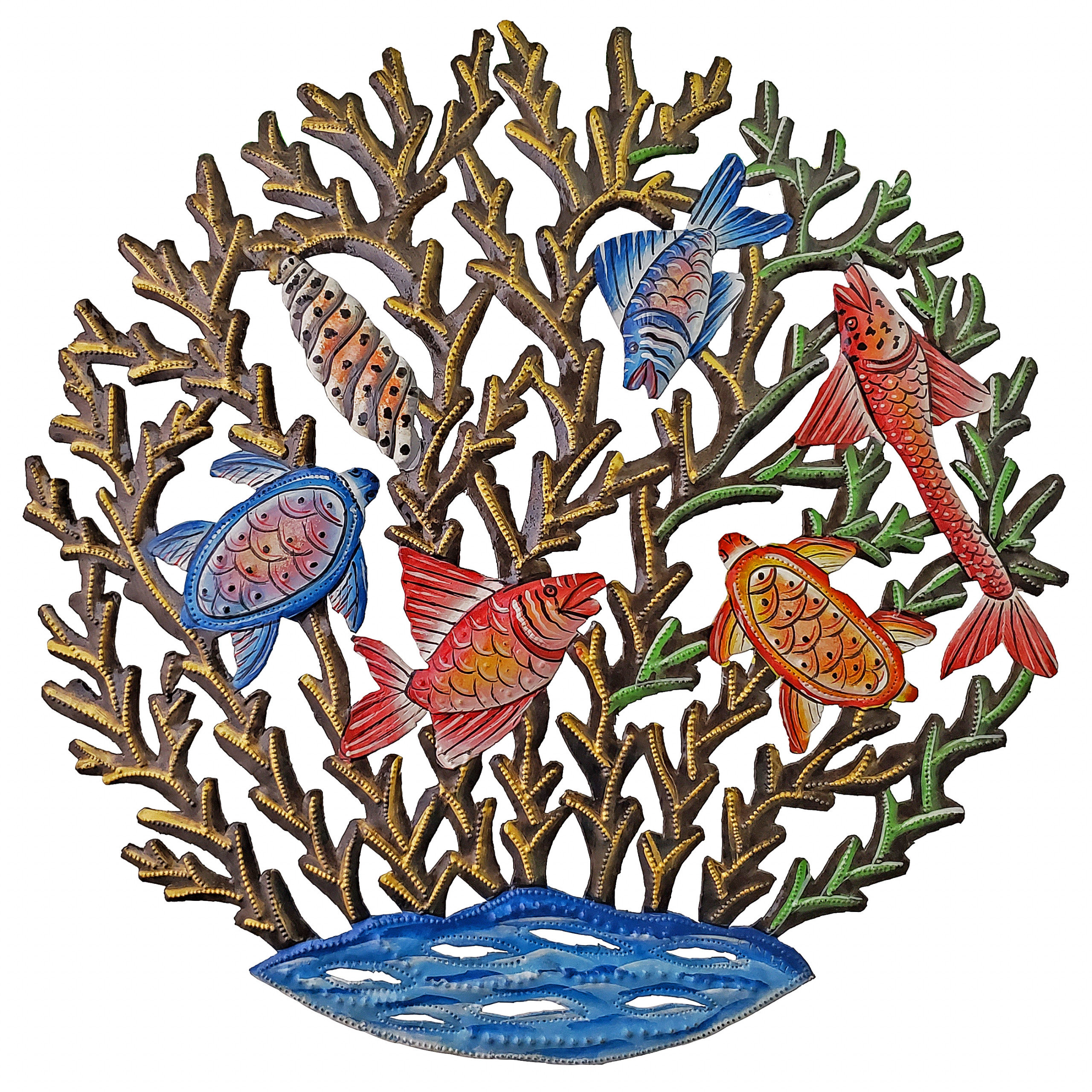 Perfect for home or garden, each Small Painted Marine is approximately 15″ x 15″ x 0.5″ and hand-chiseled out of recycled steel oil drums by Haitian artisans using techniques first developed by Georges Liautaud in the late 1950s when he chalked out his first design on a flattened steel oil drum and then cut it out by hand with a mallet and chisel. As each piece is handmade, their final dimensions and finish may vary slightly.
