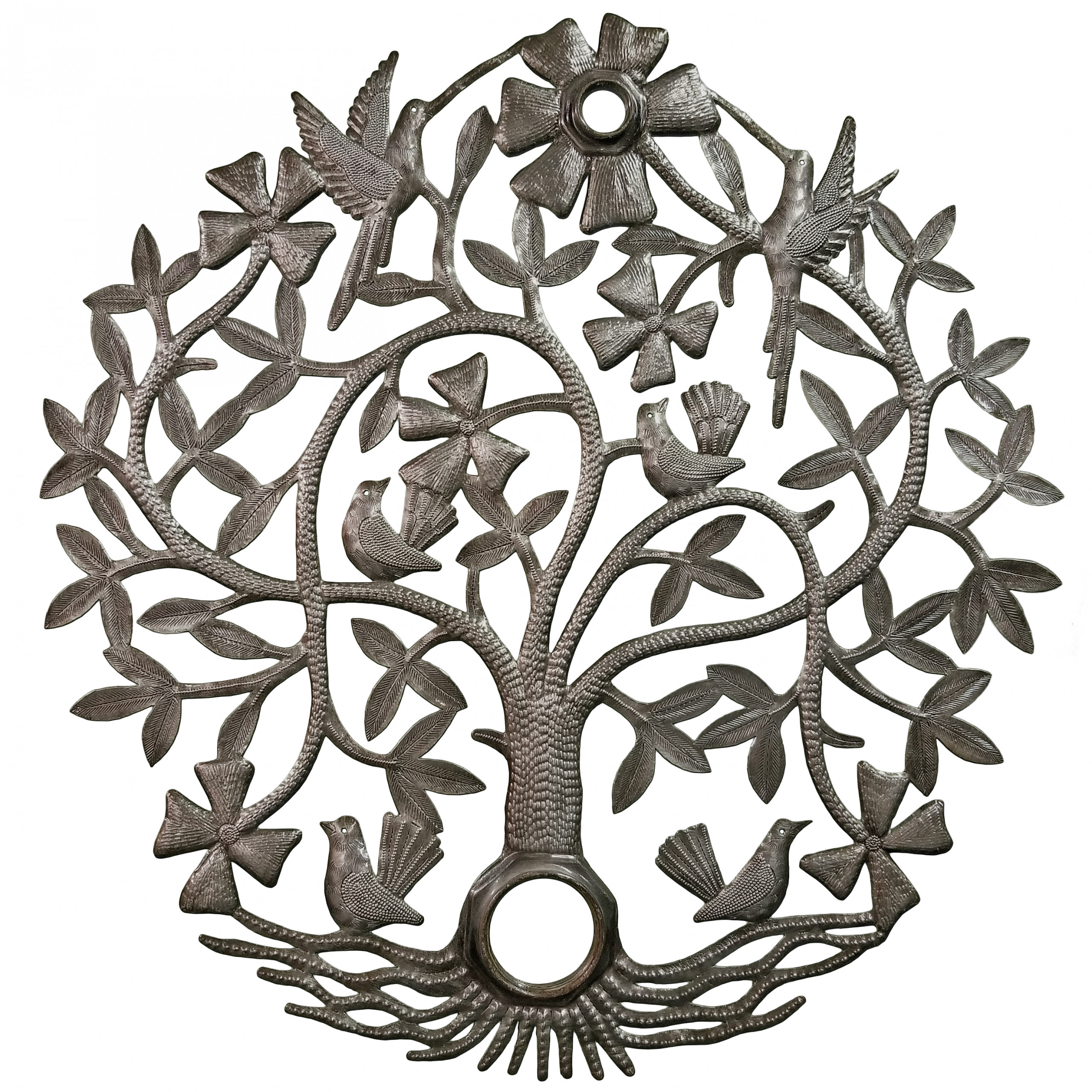 The 23" Tree & Centered Sun is hand-chiseled out of recycled steel oil drums by Haitian artisans.