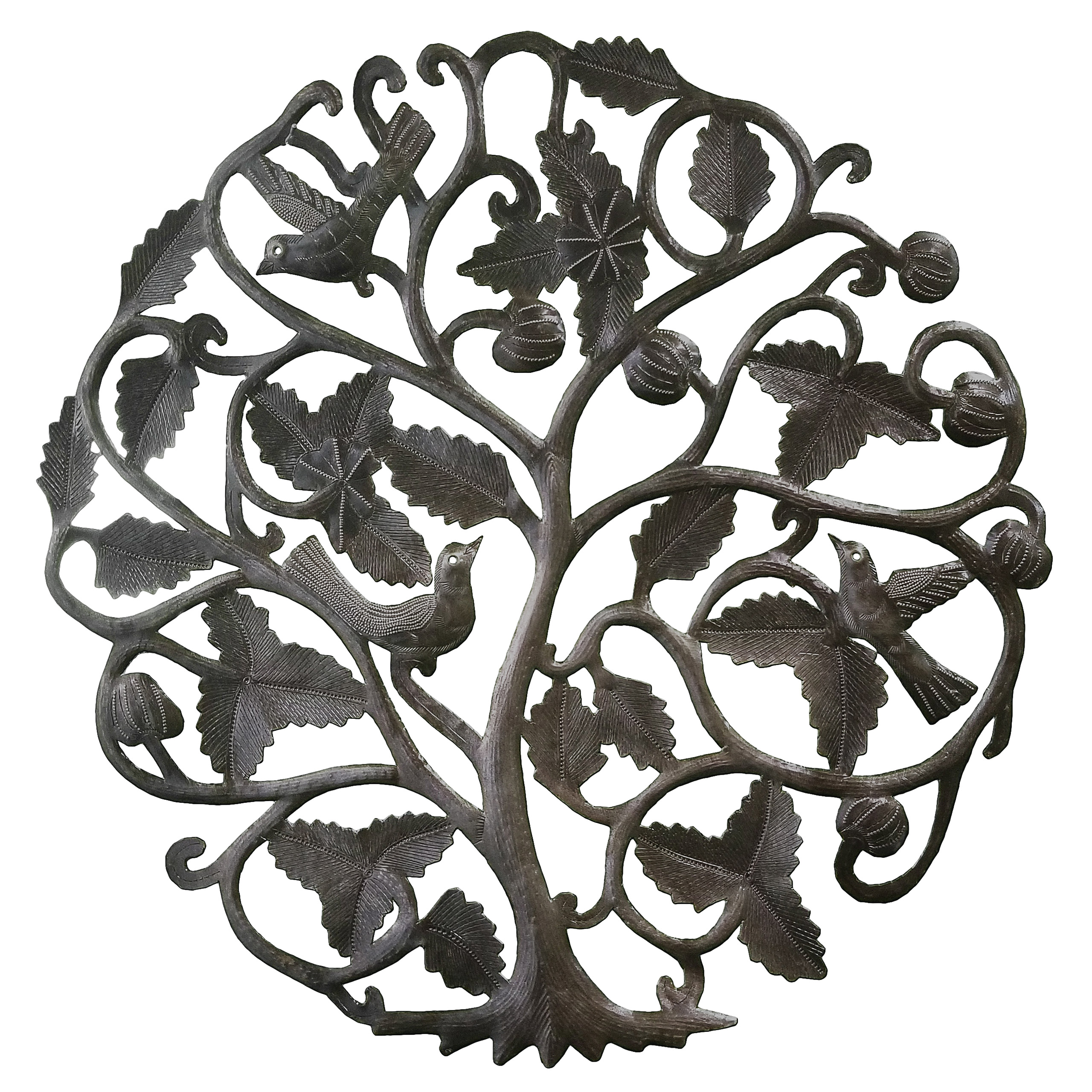Perfect for home or garden, each Oak Tree with 3 Birds is approximately 23″ x 23″ x 0.5″ and hand-chiseled out of recycled steel oil drums by Haitian artisans using techniques first developed by Georges Liautaud in the late 1950s when he chalked out his first design on a flattened steel oil drum and then cut it out by hand with a mallet and chisel. As each piece is handmade, their final dimensions and finish may vary slightly.