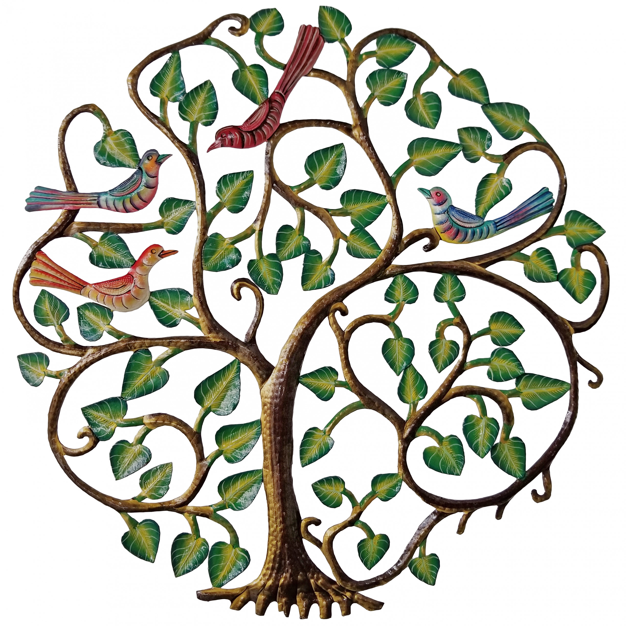 The 23" Fruit Tree with 3 Birds is hand-chiseled out of recycled steel oil drums by Haitian artisans.