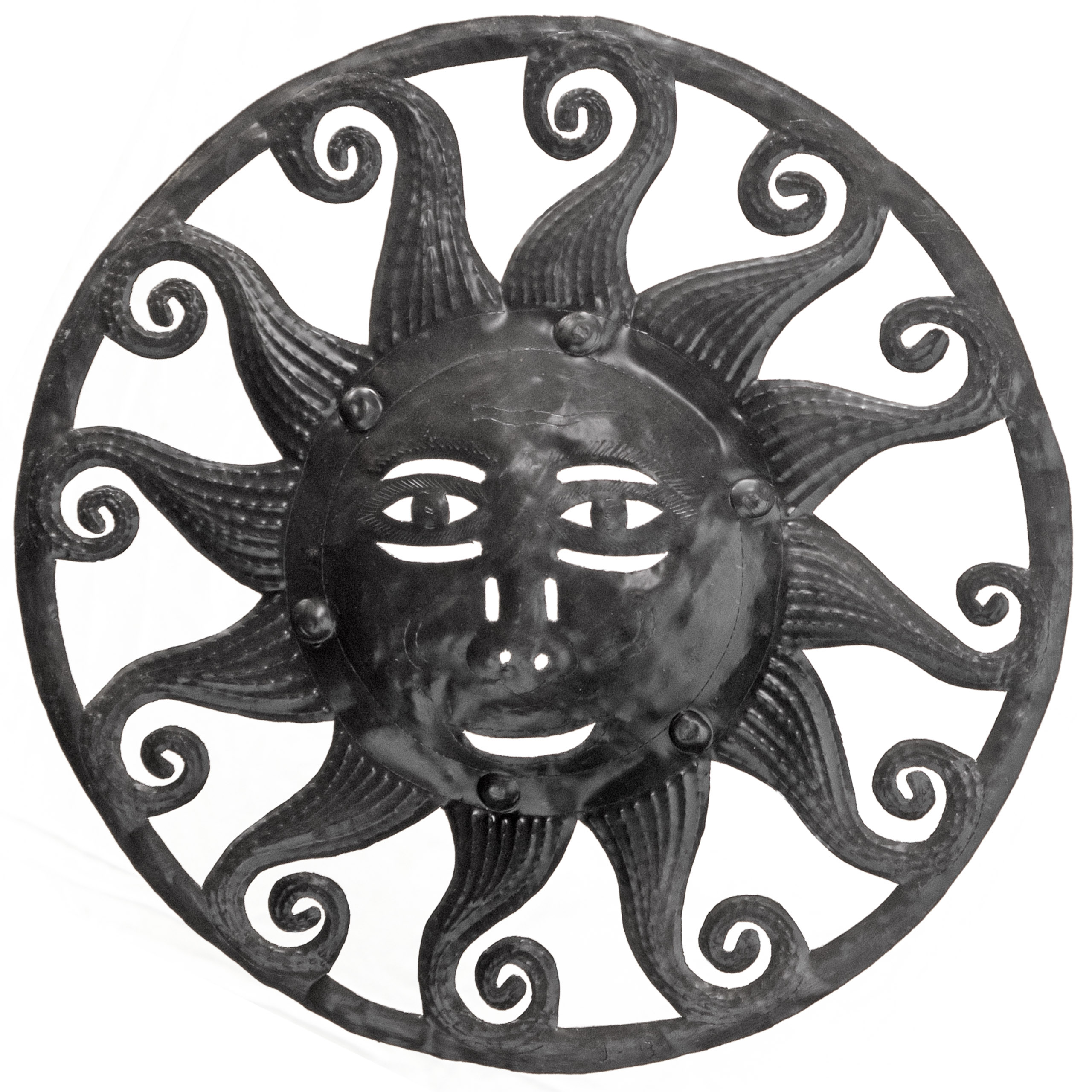 The 17" Medium Hollow Flare Sun is hand-chiseled out of recycled steel oil drums by Haitian artisans.