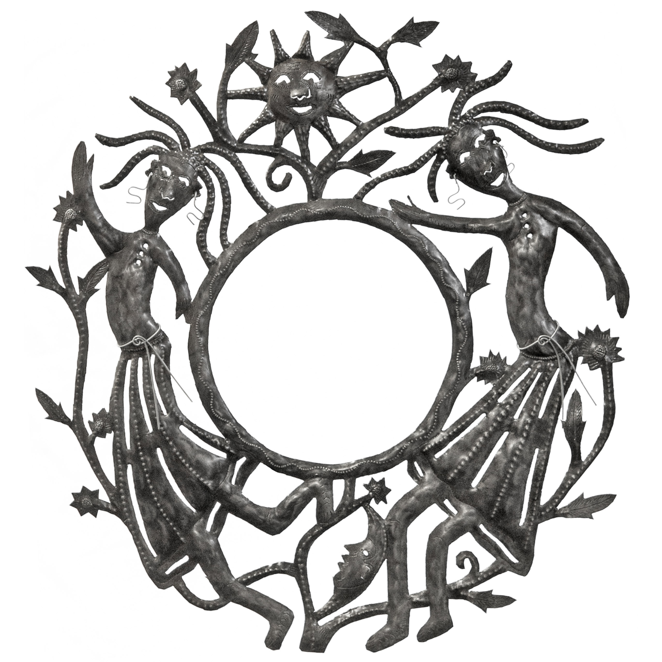 Perfect for home or garden, each Sisters Mirror is approximately 23″ x 23″ x 0.5″ and hand-chiseled out of recycled steel oil drums by Haitian artisans using techniques first developed by Georges Liautaud in the late 1950s when he chalked out his first design on a flattened steel oil drum and then cut it out by hand with a mallet and chisel. As each piece is handmade, their final dimensions and finish may vary slightly.