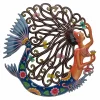 The 13.5" x 20.5" Peacock Contour is hand-chiseled out of recycled steel oil drums by Haitian artisans.