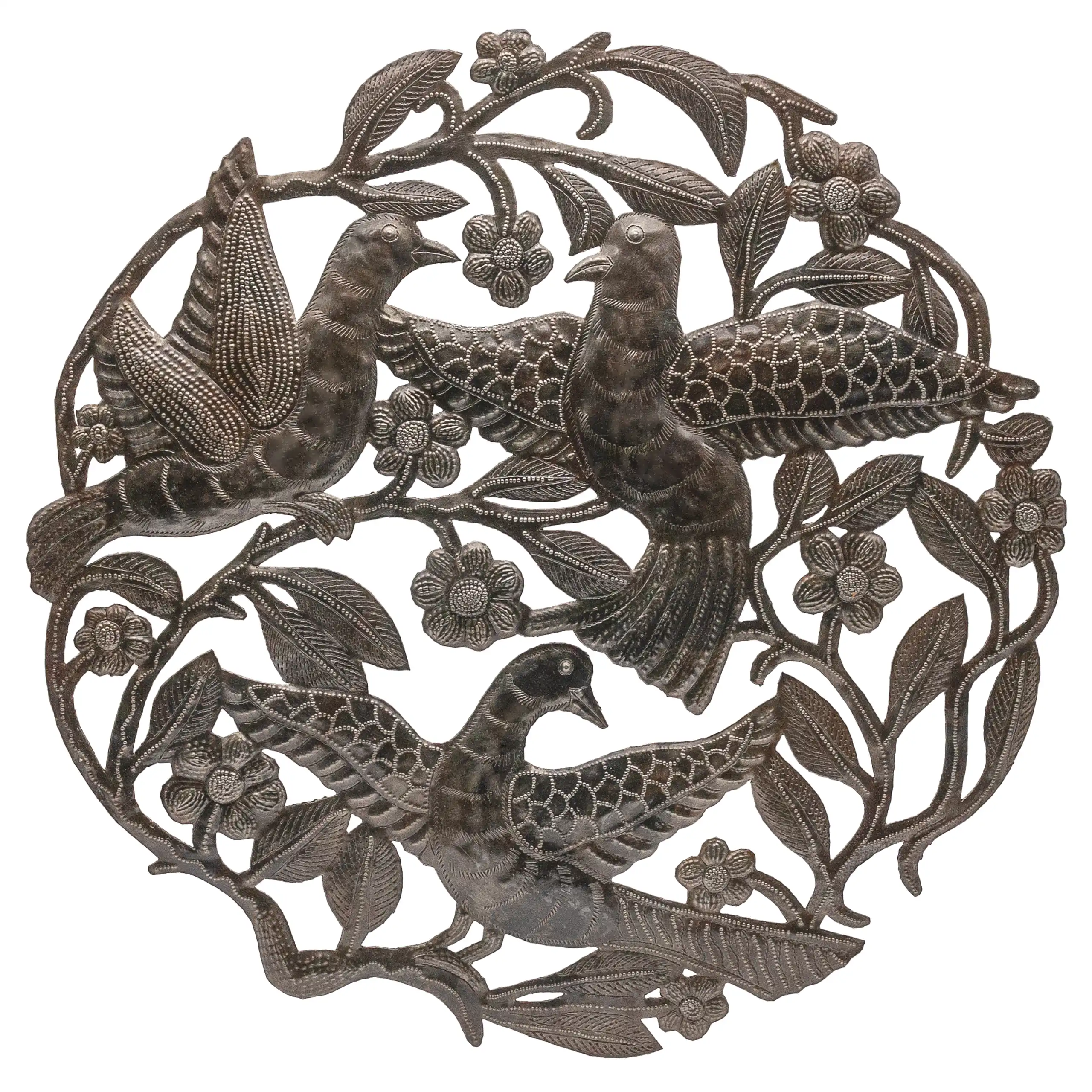 Perfect for home or garden, each 3 Birds in Vines is approximately 23.5″ x 23.5″ x 1″ and hand-chiseled out of recycled steel oil drums by Haitian artisans using techniques first developed by Georges Liautaud in the late 1950s when he chalked out his first design on a flattened steel oil drum and then cut it out by hand with a mallet and chisel. As each piece is handmade, their final dimensions and finish may vary slightly.
