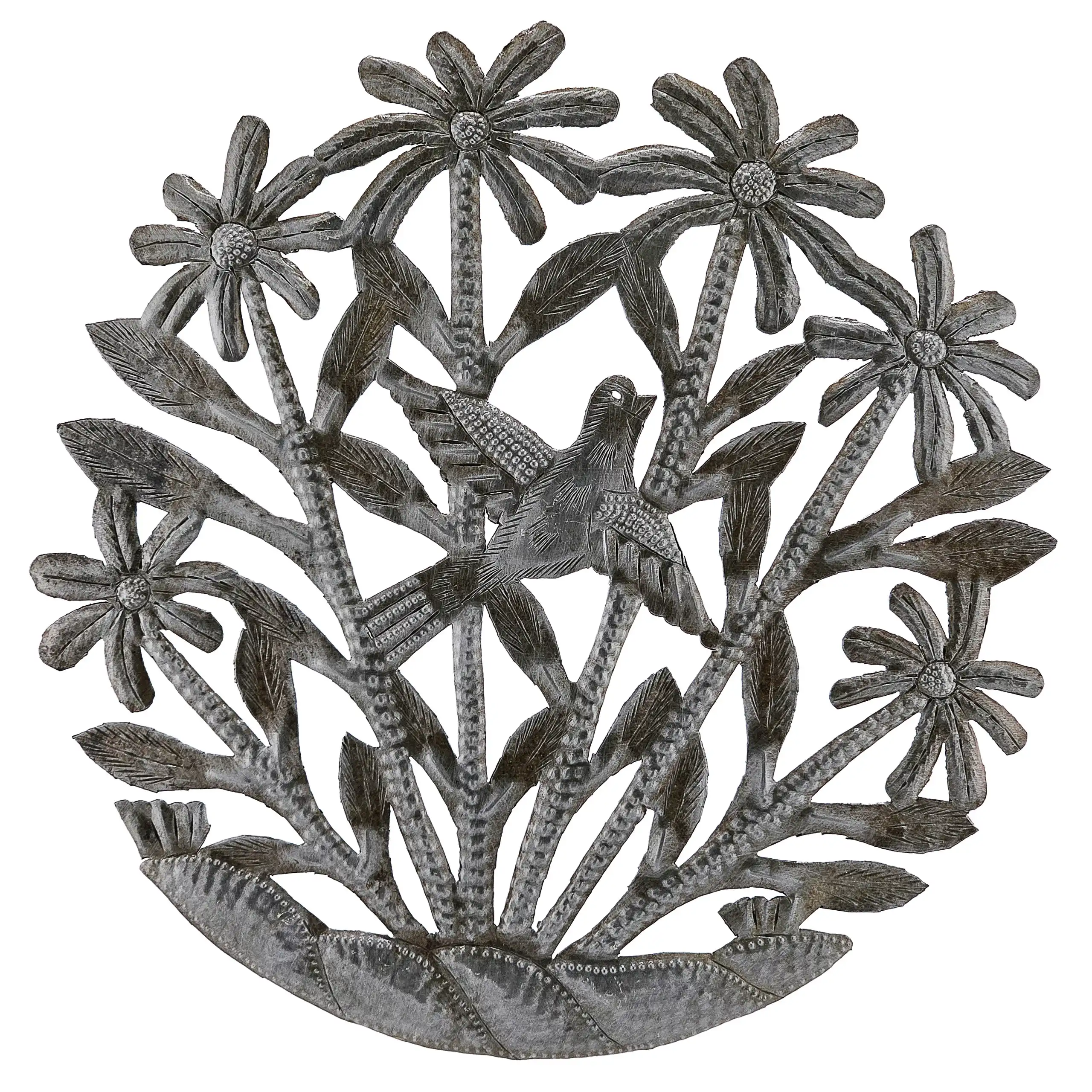 Perfect for home or garden, each Bird in Flowers is approximately 8.25″ x 8.25″ x 0.5″ and hand-chiseled out of recycled steel oil drums by Haitian artisans using techniques first developed by Georges Liautaud in the late 1950s when he chalked out his first design on a flattened steel oil drum and then cut it out by hand with a mallet and chisel. As each piece is handmade, their final dimensions and finish may vary slightly.