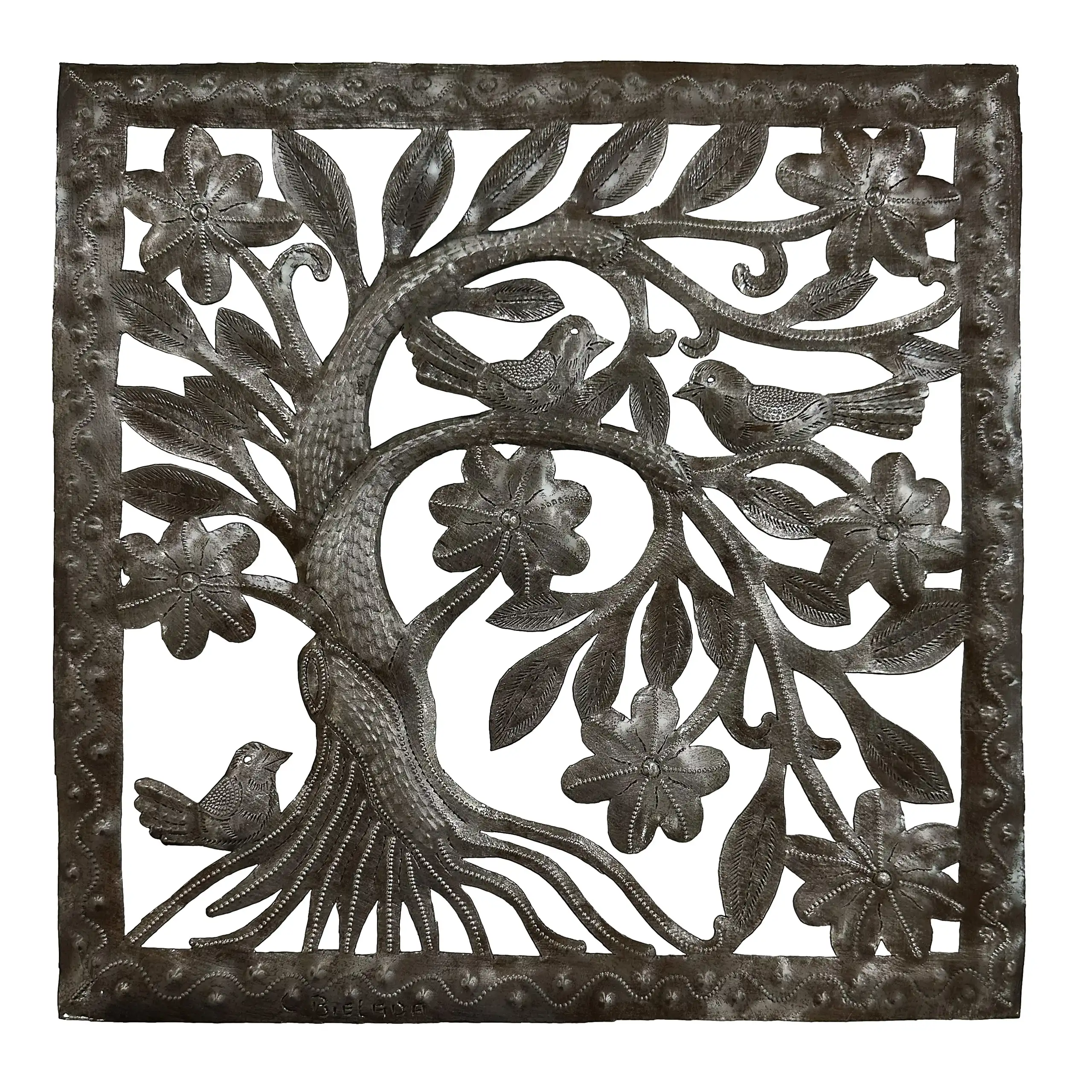 Perfect for home or garden, each Birds in Blooming Tree Square is approximately 14″ x 14″ x 0.5″ and hand-chiseled out of recycled steel oil drums by Haitian artisans using techniques first developed by Georges Liautaud in the late 1950s when he chalked out his first design on a flattened steel oil drum and then cut it out by hand with a mallet and chisel. As each piece is handmade, their final dimensions and finish may vary slightly.