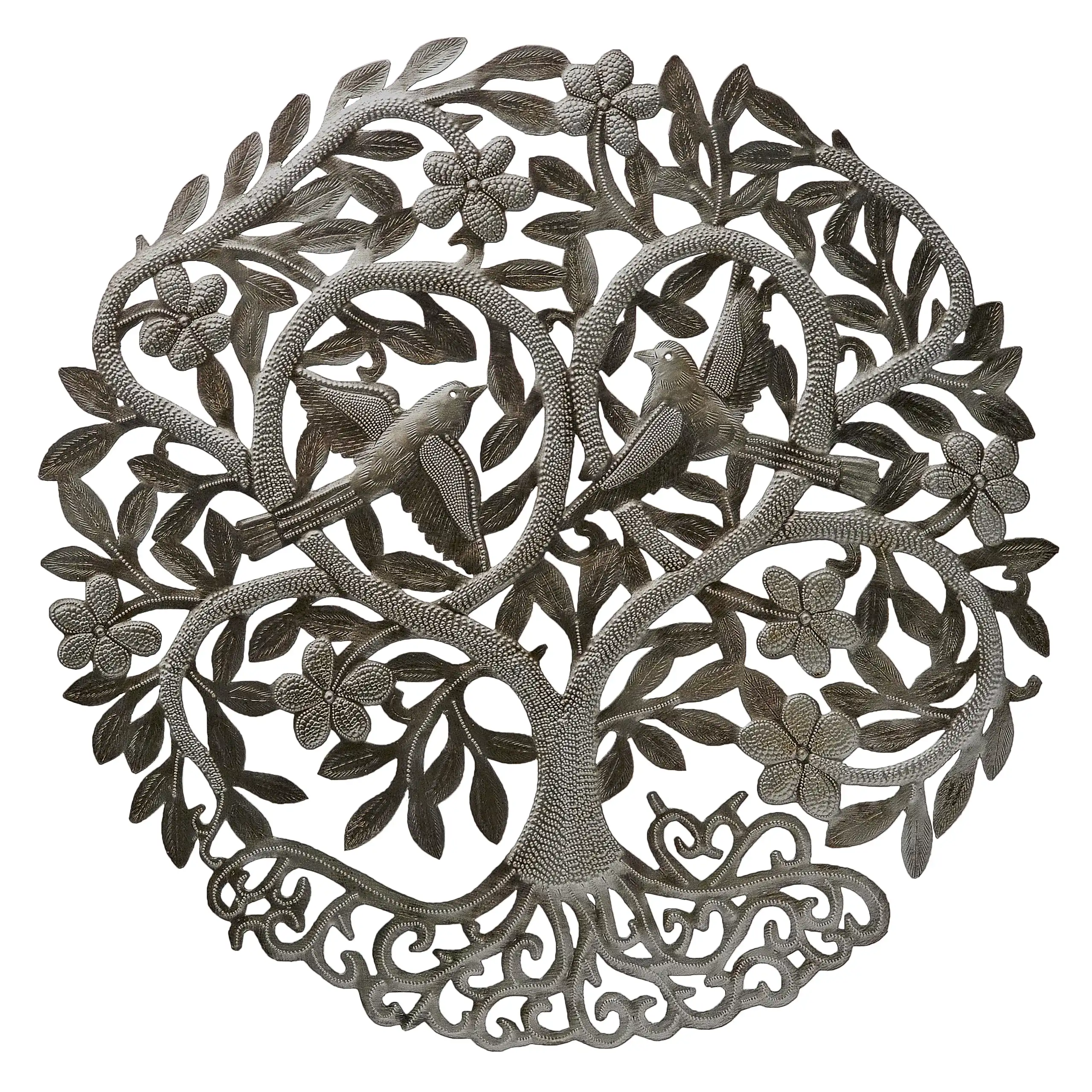Perfect for home or garden, each Blooming Love Tree is approximately 23″ x 23″ x 0.5″ and hand-chiseled out of recycled steel oil drums by Haitian artisans using techniques first developed by Georges Liautaud in the late 1950s when he chalked out his first design on a flattened steel oil drum and then cut it out by hand with a mallet and chisel. As each piece is handmade, their final dimensions and finish may vary slightly.