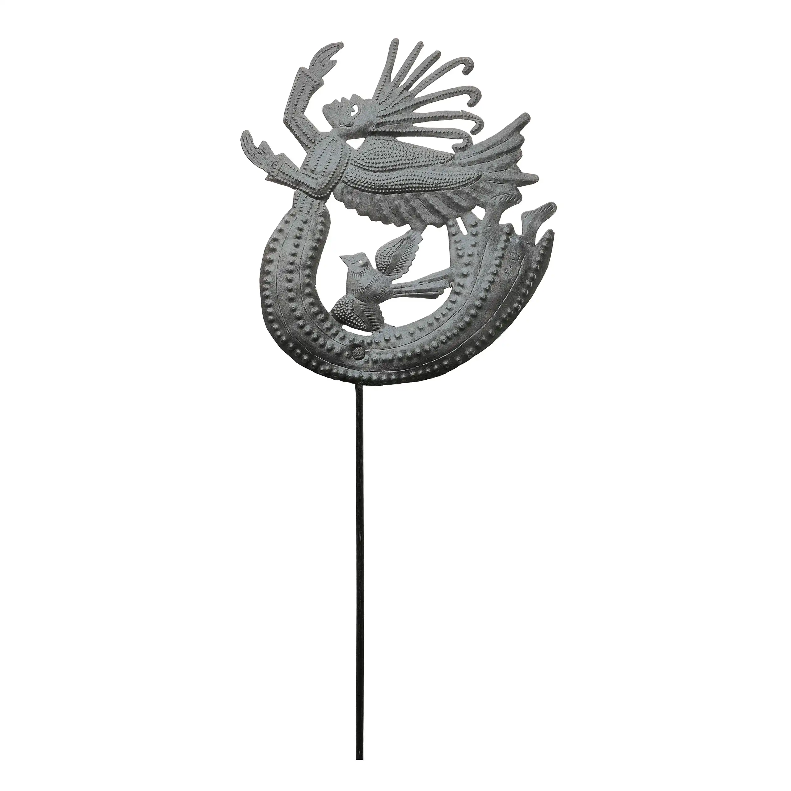 Perfect for home or garden, each Descending Angel Stake is approximately 9″ x 9.5″ x 0.5″ and hand-chiseled out of recycled steel oil drums by Haitian artisans using techniques first developed by Georges Liautaud in the late 1950s when he chalked out his first design on a flattened steel oil drum and then cut it out by hand with a mallet and chisel. As each piece is handmade, their final dimensions and finish may vary slightly.