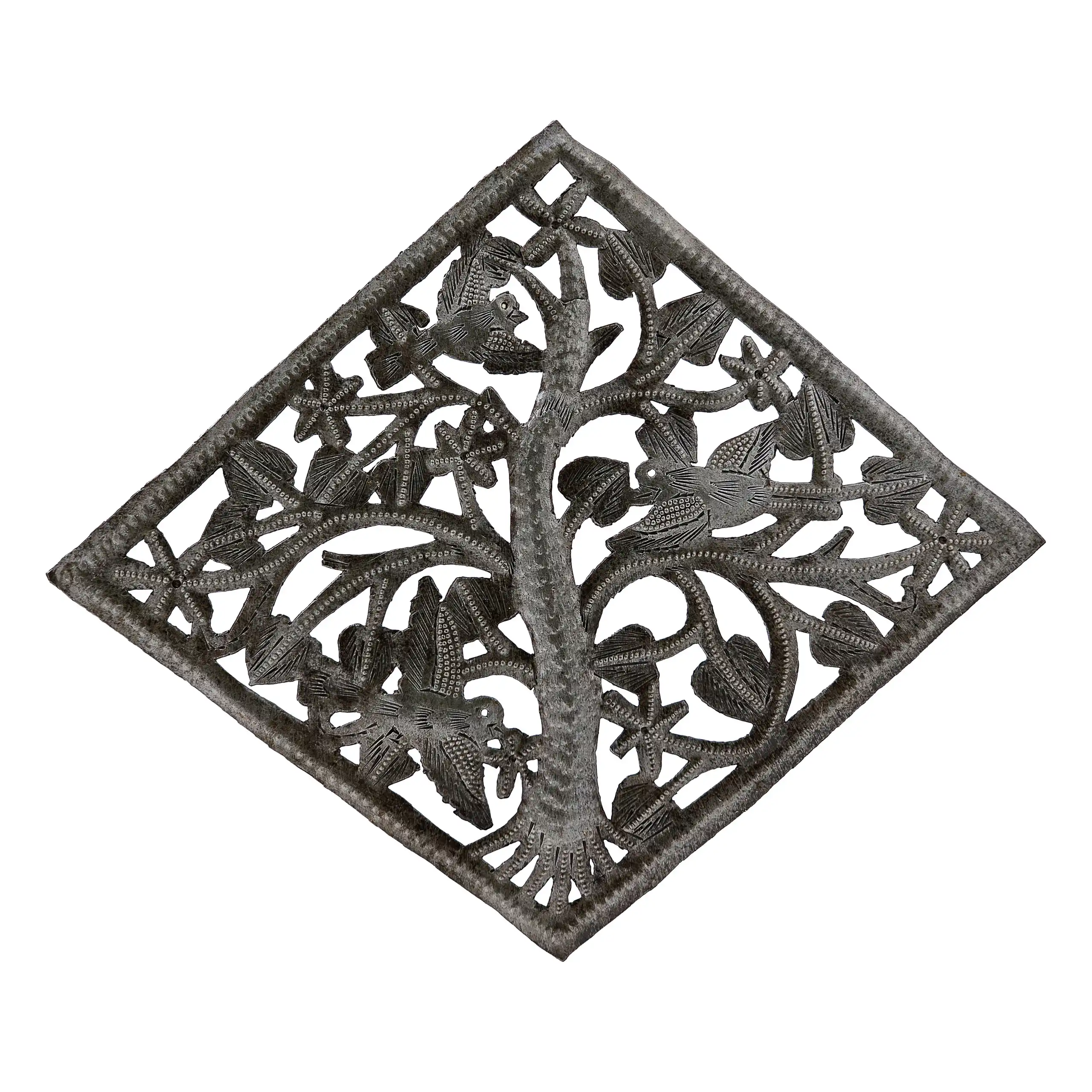 Perfect for home or garden, each Diamond Tree of Life is approximately 9.5″ x 8″ x 0.5″ and hand-chiseled out of recycled steel oil drums by Haitian artisans using techniques first developed by Georges Liautaud in the late 1950s when he chalked out his first design on a flattened steel oil drum and then cut it out by hand with a mallet and chisel. As each piece is handmade, their final dimensions and finish may vary slightly.