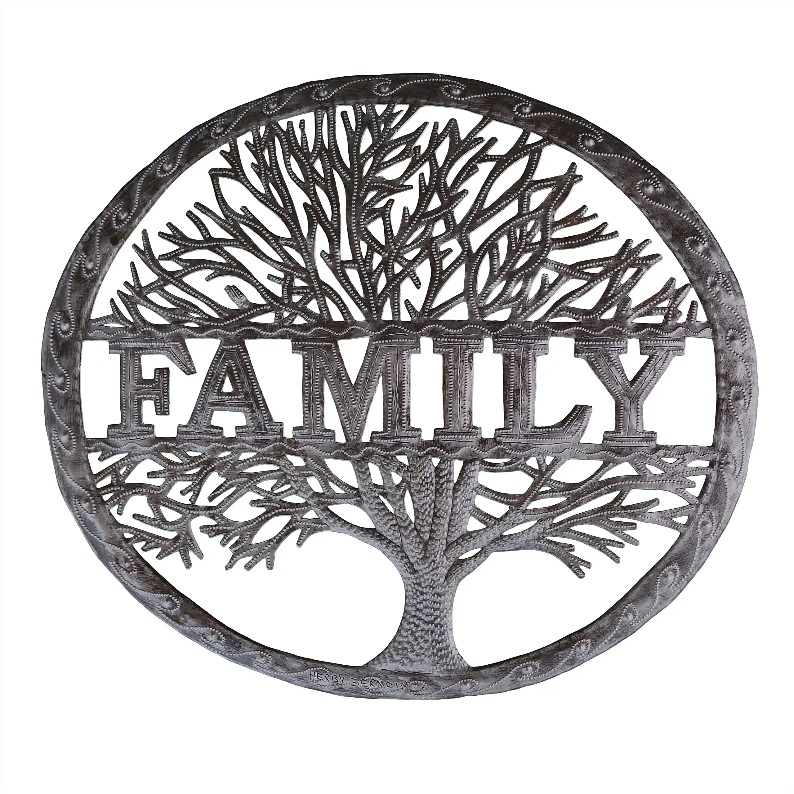 Perfect for home or garden, each Family Tree Oval with Border is approximately 15.5″ x 13.5″ x 1″ and hand-chiseled out of recycled steel oil drums by Haitian artisans using techniques first developed by Georges Liautaud in the late 1950s when he chalked out his first design on a flattened steel oil drum and then cut it out by hand with a mallet and chisel. As each piece is handmade, their final dimensions and finish may vary slightly.