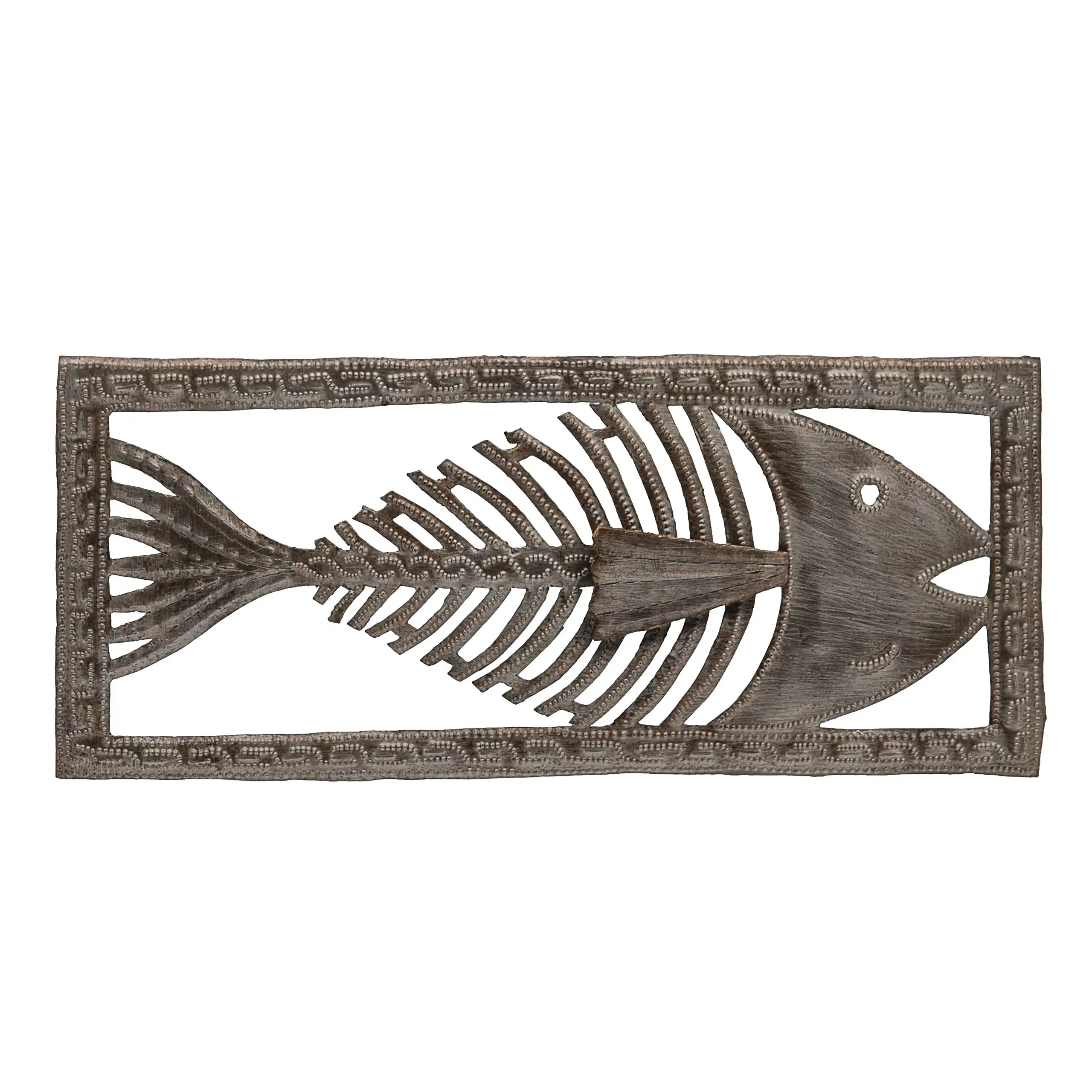 Perfect for home or garden, each Fish Bones with 3D Fin is approximately 12″ x 5″ x 1″ and hand-chiseled out of recycled steel oil drums by Haitian artisans using techniques first developed by Georges Liautaud in the late 1950s when he chalked out his first design on a flattened steel oil drum and then cut it out by hand with a mallet and chisel. As each piece is handmade, their final dimensions and finish may vary slightly.