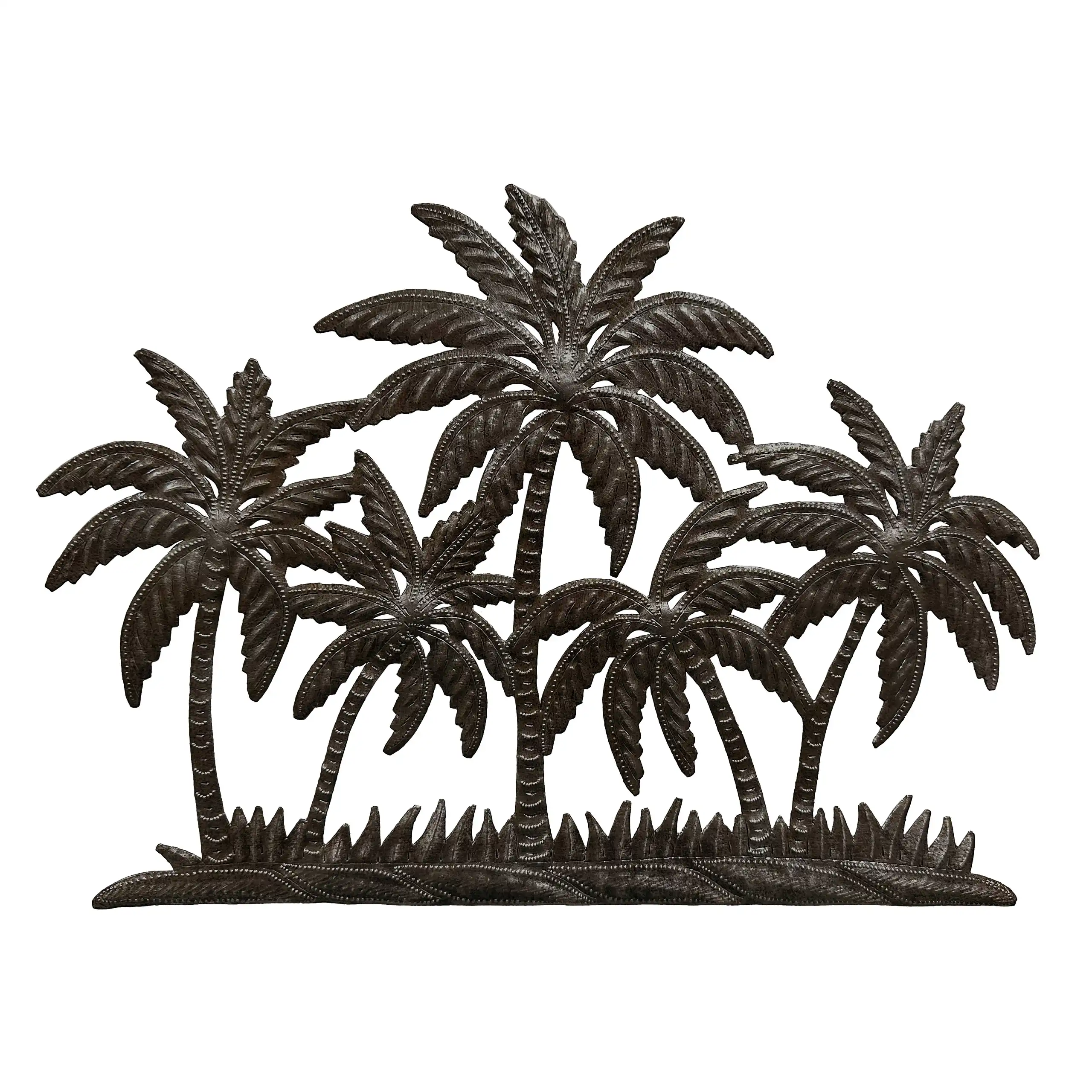Perfect for home or garden, each Five Palms is approximately 17″ x 12″ x 0.5″ and hand-chiseled out of recycled steel oil drums by Haitian artisans using techniques first developed by Georges Liautaud in the late 1950s when he chalked out his first design on a flattened steel oil drum and then cut it out by hand with a mallet and chisel. As each piece is handmade, their final dimensions and finish may vary slightly.