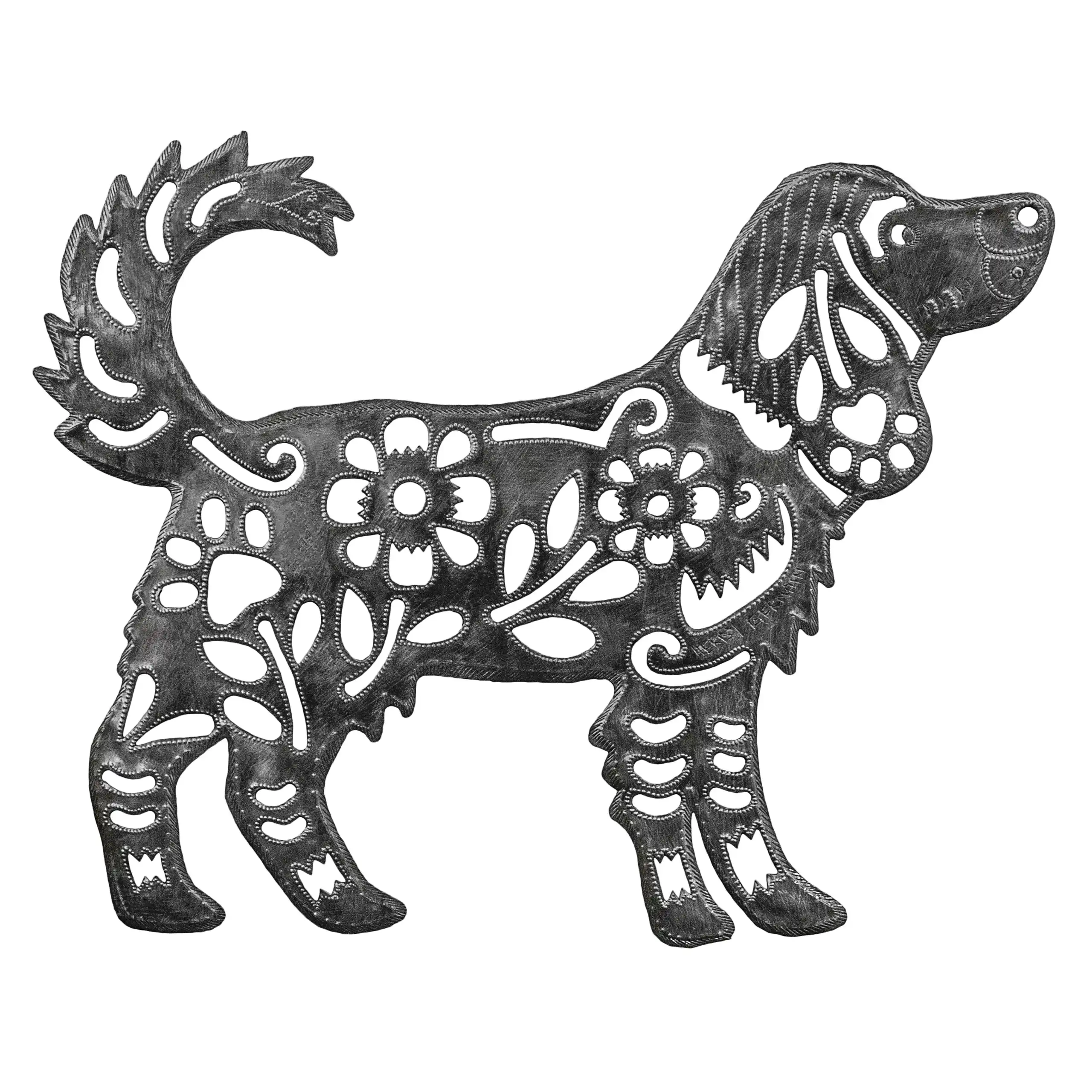 Perfect for home or garden, each Floral Standing Shaggy Dog is approximately 16″ x 12.75″ x 0.5″ and hand-chiseled out of recycled steel oil drums by Haitian artisans using techniques first developed by Georges Liautaud in the late 1950s when he chalked out his first design on a flattened steel oil drum and then cut it out by hand with a mallet and chisel. As each piece is handmade, their final dimensions and finish may vary slightly.