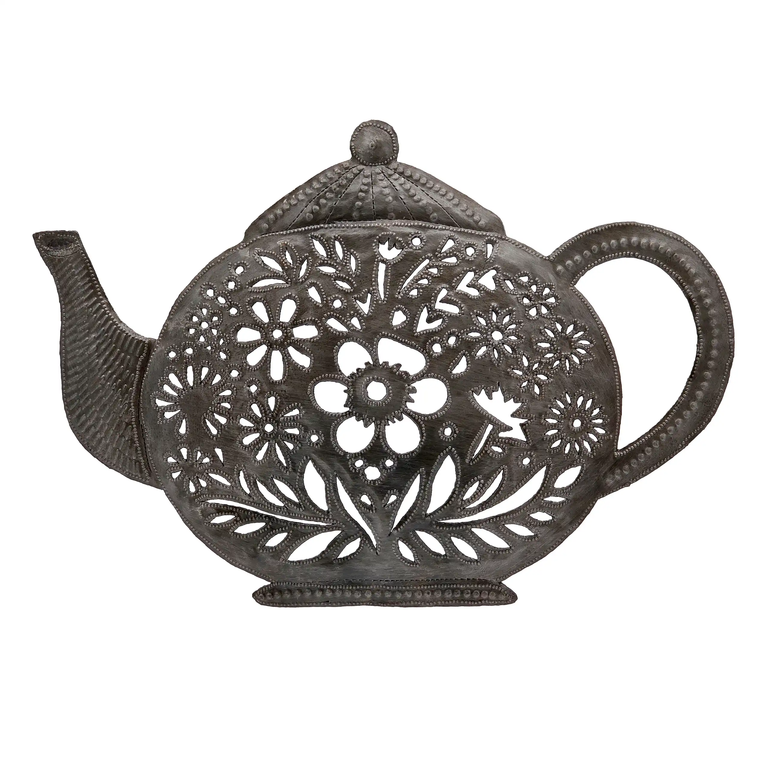 Perfect for home or garden, each Floral Teapot is approximately 14.25″ x 10″ x 0.5″ and hand-chiseled out of recycled steel oil drums by Haitian artisans using techniques first developed by Georges Liautaud in the late 1950s when he chalked out his first design on a flattened steel oil drum and then cut it out by hand with a mallet and chisel. As each piece is handmade, their final dimensions and finish may vary slightly.