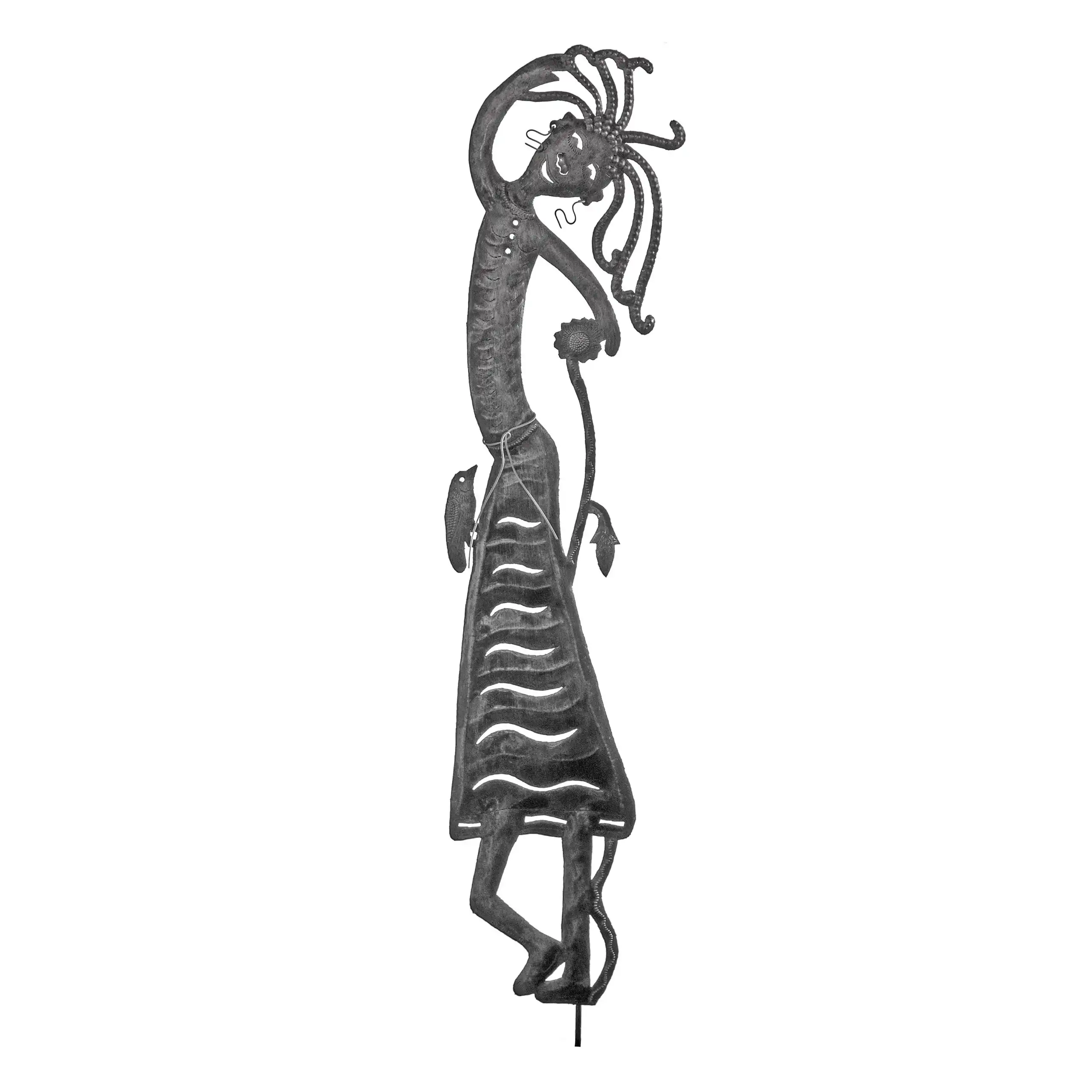 Perfect for home or garden, each Garden Girl with Bird Stake is approximately 9″ x 33.5″ x 0.5″ and hand-chiseled out of recycled steel oil drums by Haitian artisans using techniques first developed by Georges Liautaud in the late 1950s when he chalked out his first design on a flattened steel oil drum and then cut it out by hand with a mallet and chisel. As each piece is handmade, their final dimensions and finish may vary slightly.