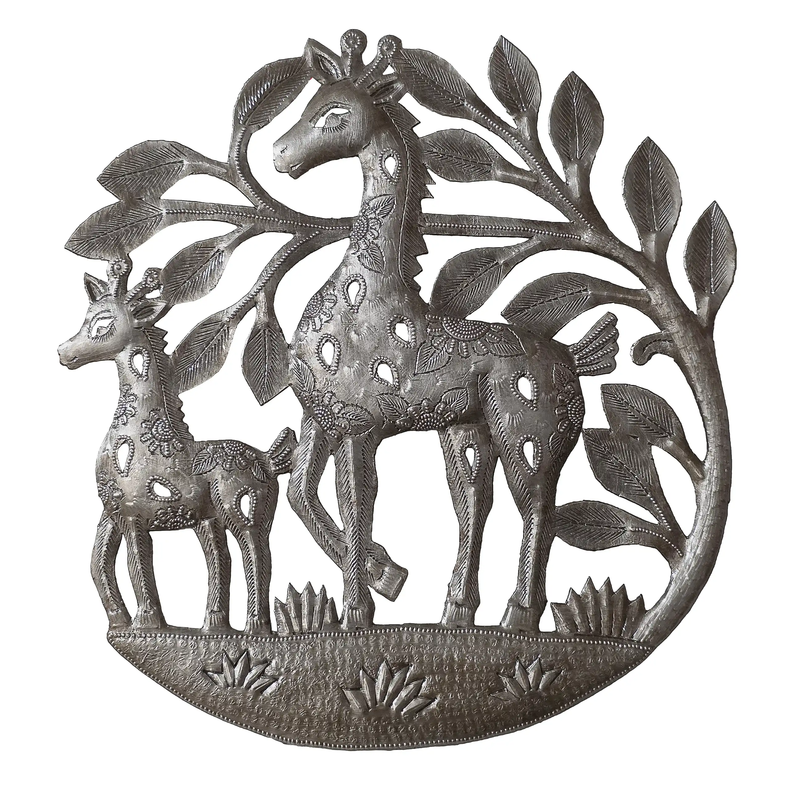 Perfect for home or garden, each Giraffes is approximately 9.5″ x 9.5″ x 0.5″ and hand-chiseled out of recycled steel oil drums by Haitian artisans using techniques first developed by Georges Liautaud in the late 1950s when he chalked out his first design on a flattened steel oil drum and then cut it out by hand with a mallet and chisel. As each piece is handmade, their final dimensions and finish may vary slightly.