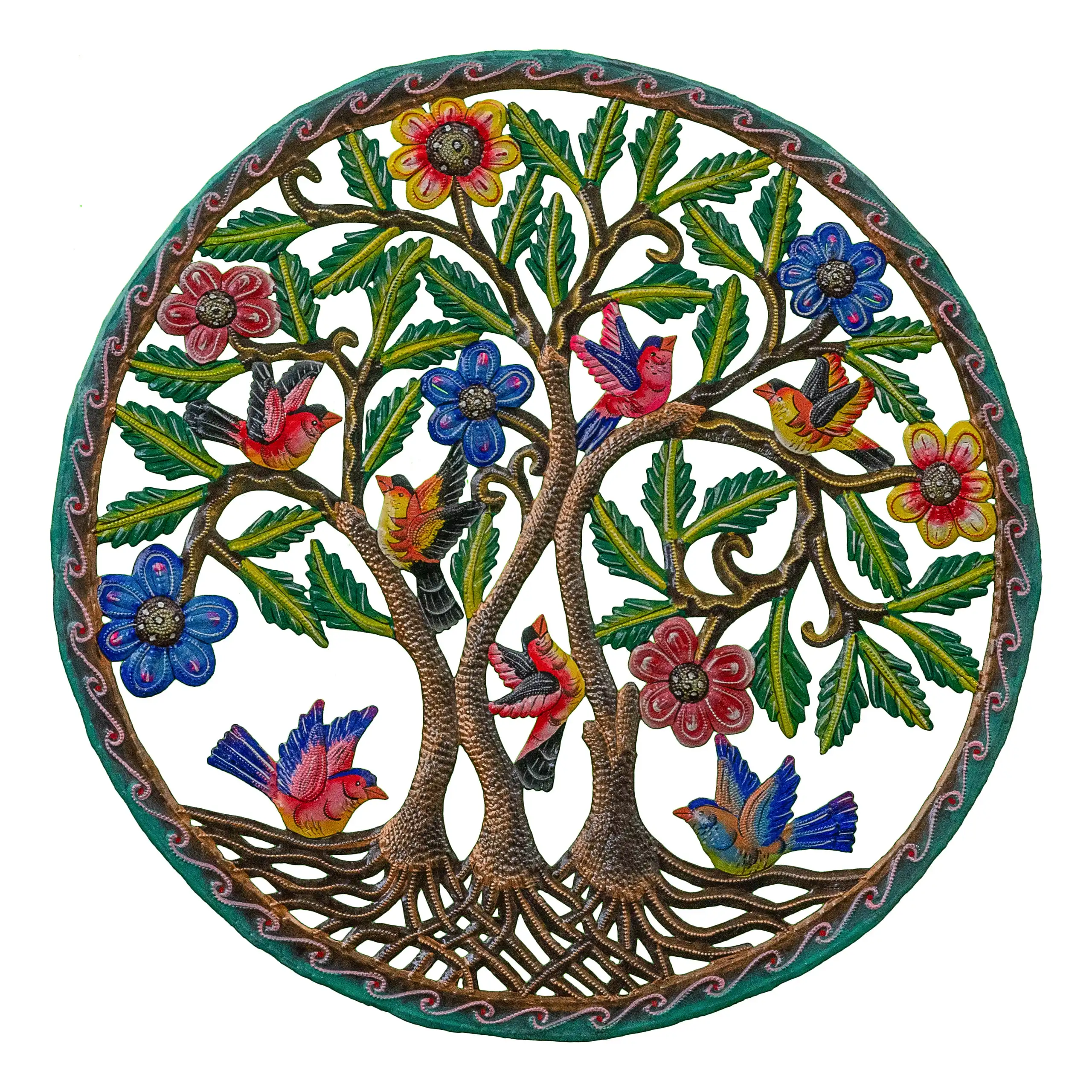 Perfect for home or garden, each Medium Painted 3 Trees with 7 Birds is approximately 22.5″ x 22.5″ x 0.5″ and hand-chiseled out of recycled steel oil drums by Haitian artisans using techniques first developed by Georges Liautaud in the late 1950s when he chalked out his first design on a flattened steel oil drum and then cut it out by hand with a mallet and chisel. As each piece is handmade, their final dimensions and finish may vary slightly.