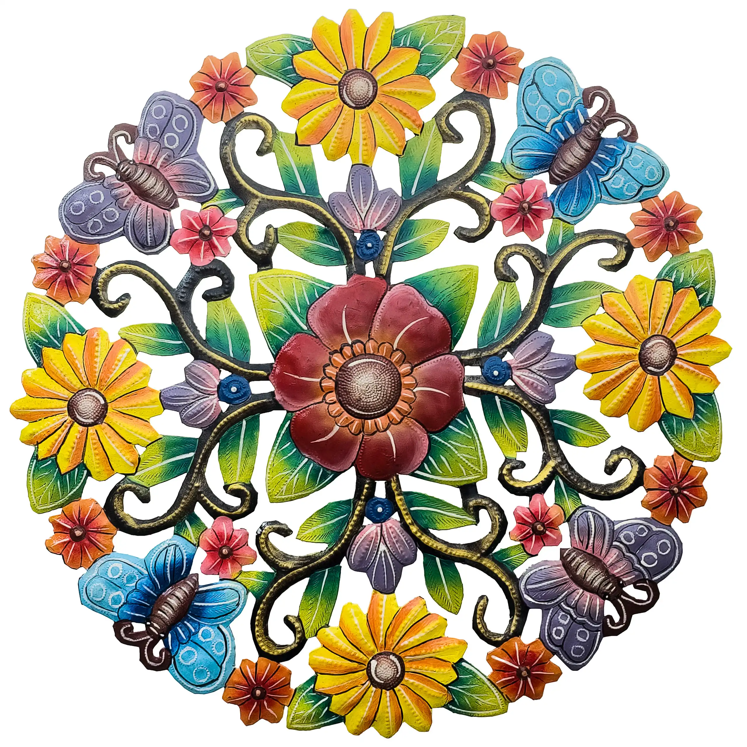 Perfect for home or garden, each Medium Painted Floral Crown is approximately 20.5″ x 20.5″ x 0.5″ and hand-chiseled out of recycled steel oil drums by Haitian artisans using techniques first developed by Georges Liautaud in the late 1950s when he chalked out his first design on a flattened steel oil drum and then cut it out by hand with a mallet and chisel. As each piece is handmade, their final dimensions and finish may vary slightly.