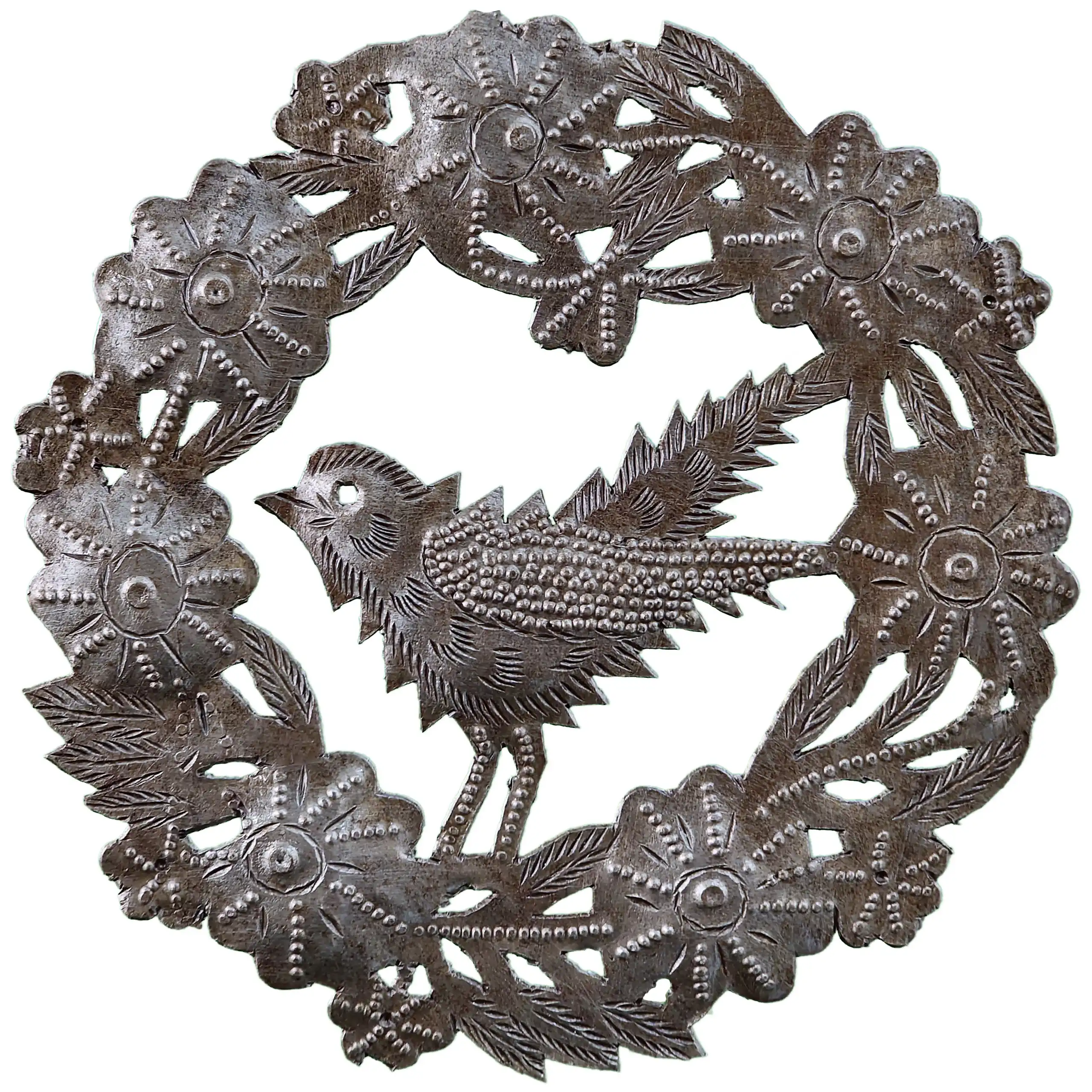Perfect for home or garden, each Mini Floral Bird Wreath is approximately 5″ x 5″ x 0.5″ and hand-chiseled out of recycled steel oil drums by Haitian artisans using techniques first developed by Georges Liautaud in the late 1950s when he chalked out his first design on a flattened steel oil drum and then cut it out by hand with a mallet and chisel. As each piece is handmade, their final dimensions and finish may vary slightly.