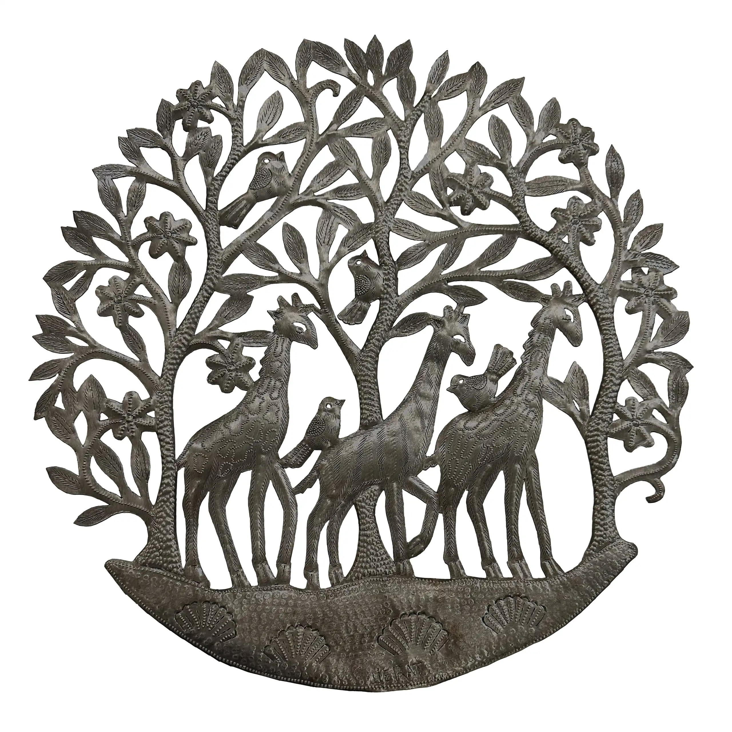 The 33" Nesting Tree is hand-chiseled out of recycled steel oil drums by Haitian artisans.