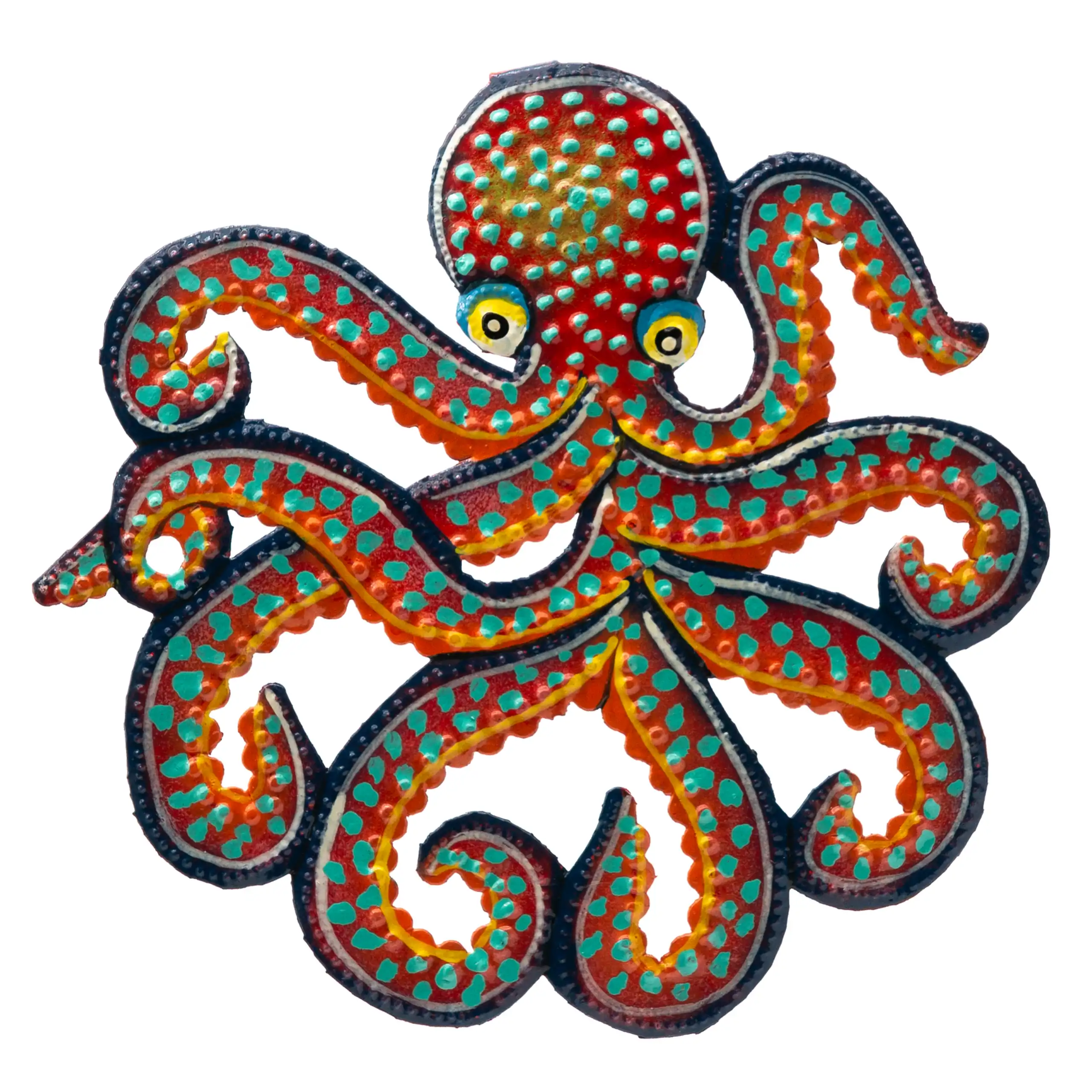 Perfect for home or garden, each Mini Painted Blue & Orange Octopus is approximately 8.5″ x 8.5″ x 0.5″ and hand-chiseled out of recycled steel oil drums by Haitian artisans using techniques first developed by Georges Liautaud in the late 1950s when he chalked out his first design on a flattened steel oil drum and then cut it out by hand with a mallet and chisel. As each piece is handmade, their final dimensions and finish may vary slightly.