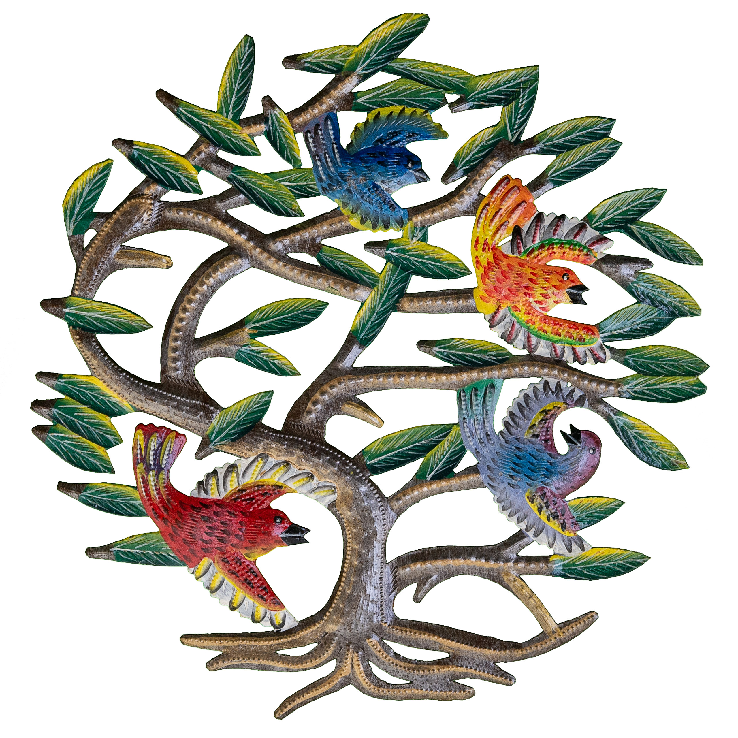 The 23" Fruit Tree with 3 Birds is hand-chiseled out of recycled steel oil drums by Haitian artisans.