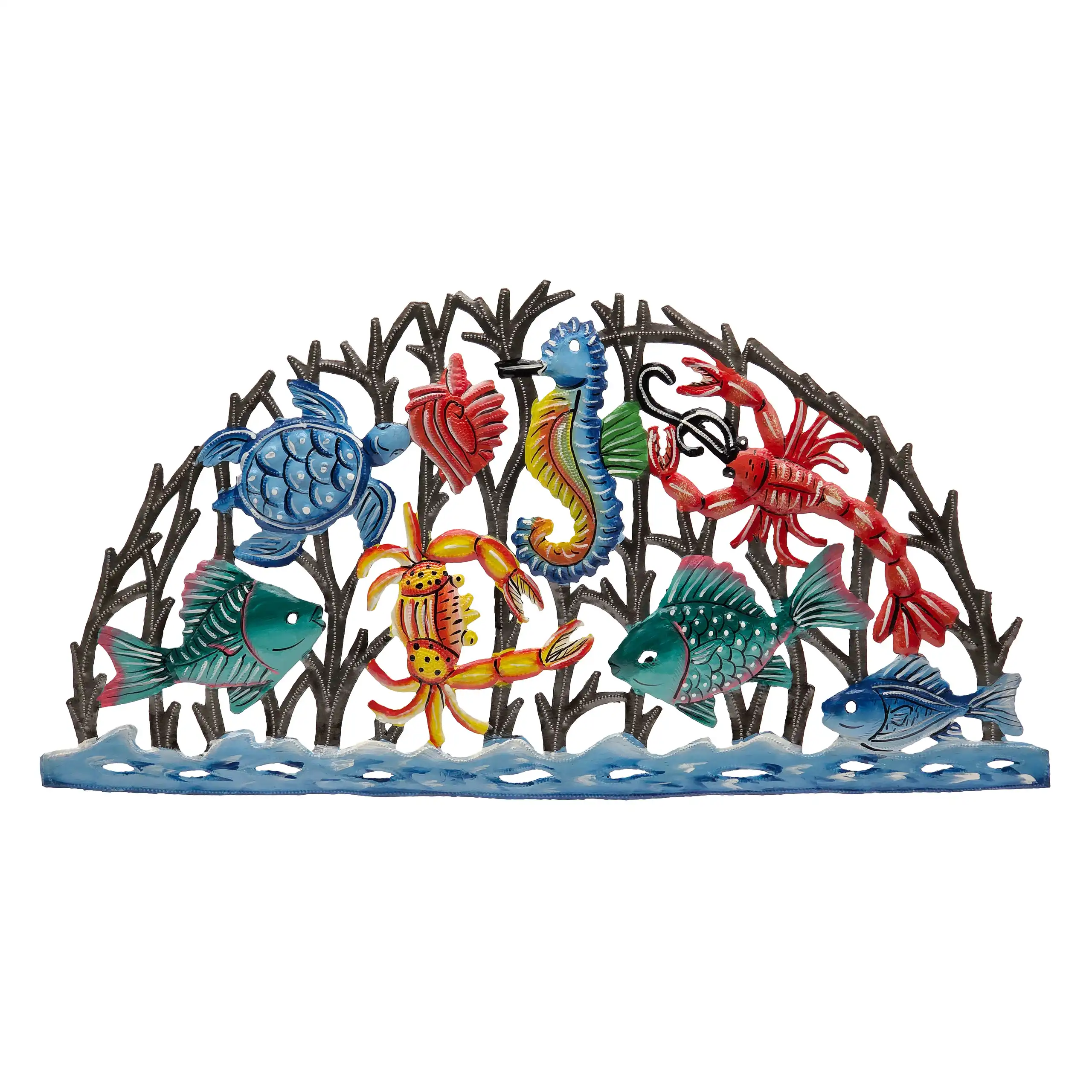 Perfect for home or garden, each Painted Aquatic Life Arch is approximately 22.25″ x 11.5″ x 0.5″ and hand-chiseled out of recycled steel oil drums by Haitian artisans using techniques first developed by Georges Liautaud in the late 1950s when he chalked out his first design on a flattened steel oil drum and then cut it out by hand with a mallet and chisel. As each piece is handmade, their final dimensions and finish may vary slightly.