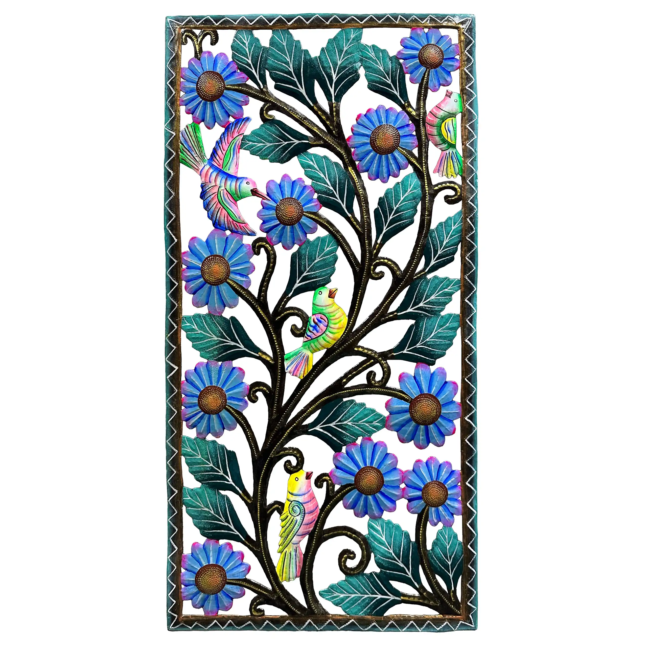 Perfect for home or garden, each Painted Bird and Blooms Panel is approximately 17″ x 32″ x 1″ and hand-chiseled out of recycled steel oil drums by Haitian artisans using techniques first developed by Georges Liautaud in the late 1950s when he chalked out his first design on a flattened steel oil drum and then cut it out by hand with a mallet and chisel. As each piece is handmade, their final dimensions and finish may vary slightly.