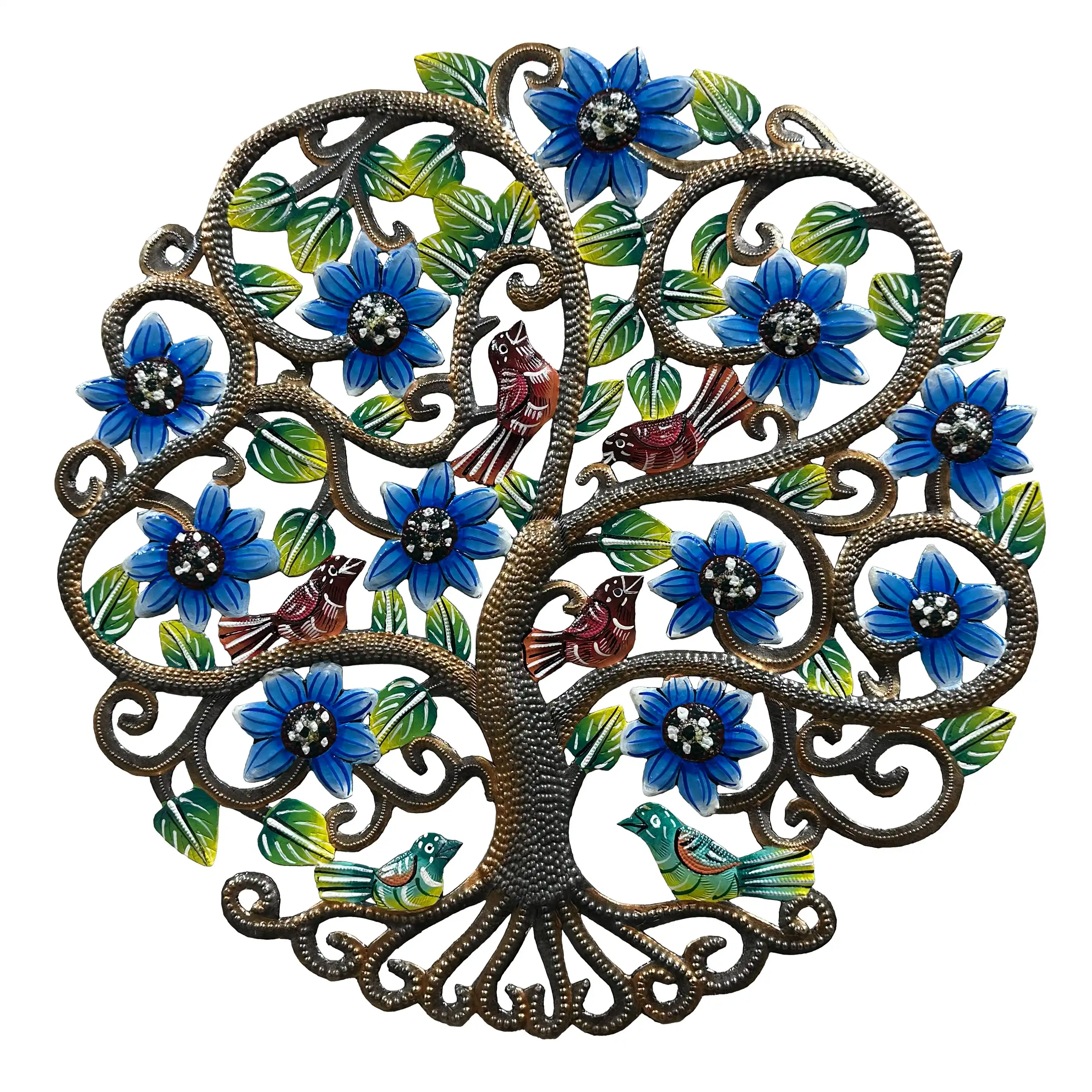 Perfect for home or garden, each Painted Birds in Bloom Tree is approximately 17″ x 17″ x 0.5″ and hand-chiseled out of recycled steel oil drums by Haitian artisans using techniques first developed by Georges Liautaud in the late 1950s when he chalked out his first design on a flattened steel oil drum and then cut it out by hand with a mallet and chisel. As each piece is handmade, their final dimensions and finish may vary slightly.
