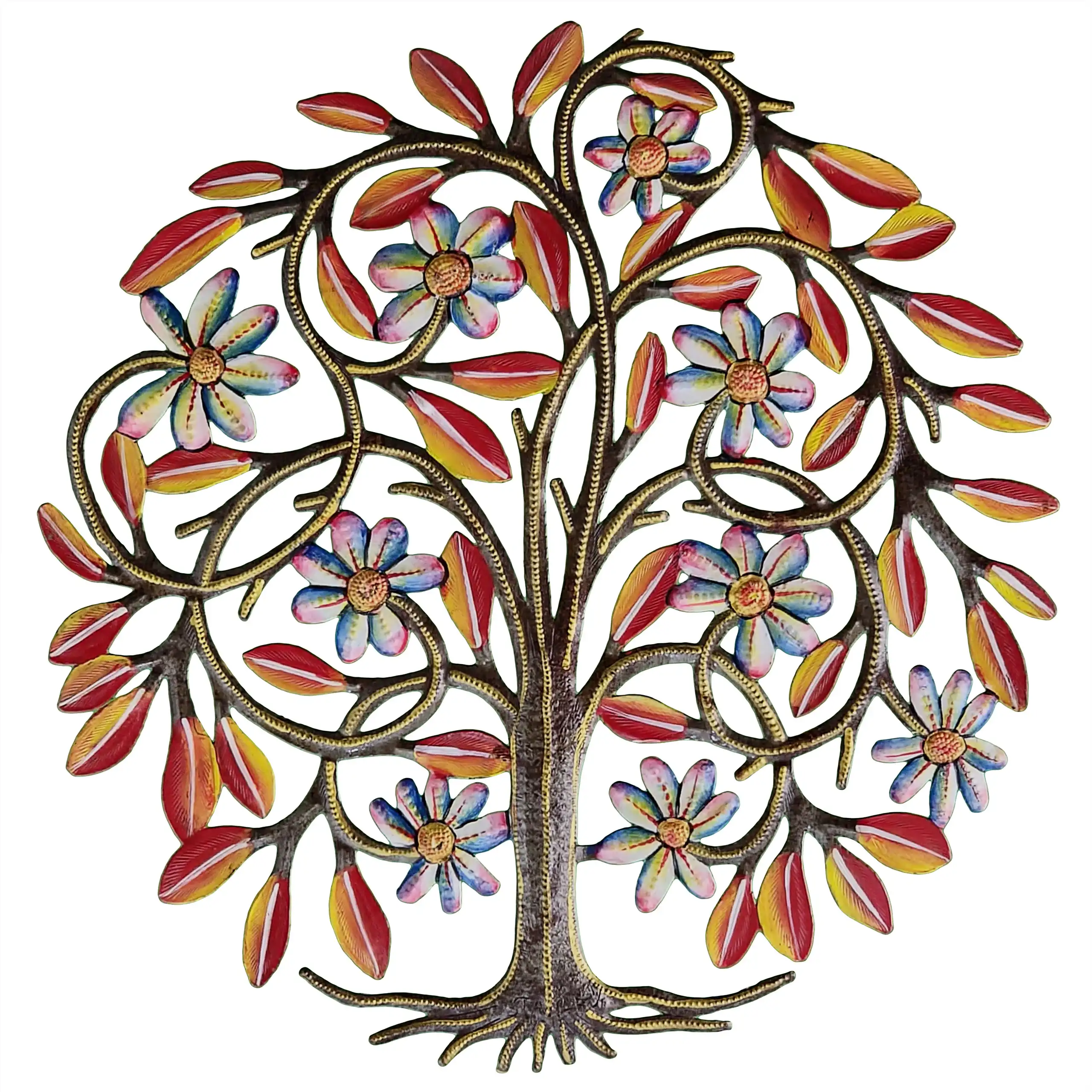 Perfect for home or garden, each Painted Blooming Tree is approximately 14″ x 14″ x 0.5″ and hand-chiseled out of recycled steel oil drums by Haitian artisans using techniques first developed by Georges Liautaud in the late 1950s when he chalked out his first design on a flattened steel oil drum and then cut it out by hand with a mallet and chisel. As each piece is handmade, their final dimensions and finish may vary slightly.