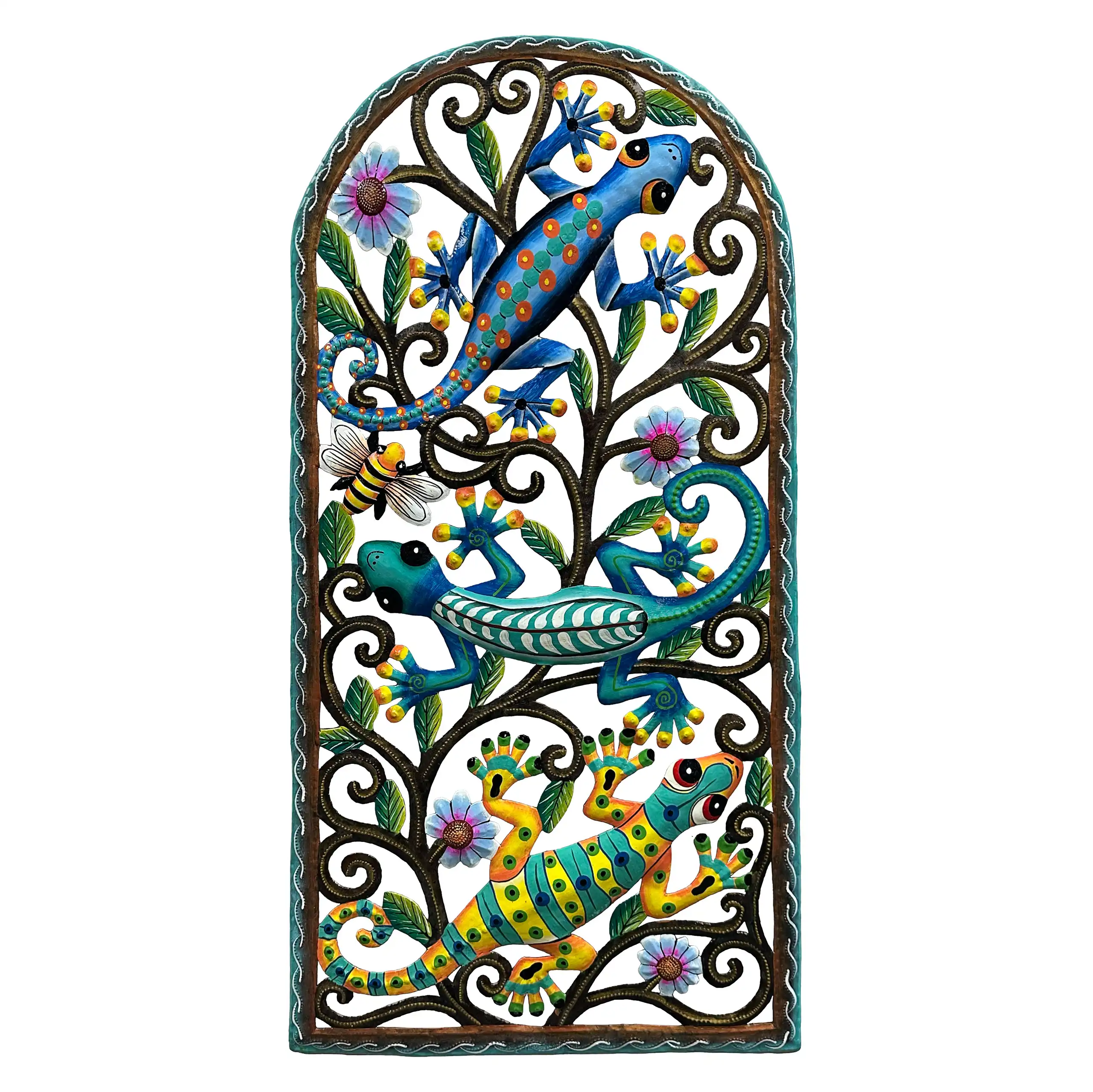 Perfect for home or garden, each Painted Gecko in Blooms Arch is approximately 17″ x 32″ x 1″ and hand-chiseled out of recycled steel oil drums by Haitian artisans using techniques first developed by Georges Liautaud in the late 1950s when he chalked out his first design on a flattened steel oil drum and then cut it out by hand with a mallet and chisel. As each piece is handmade, their final dimensions and finish may vary slightly.