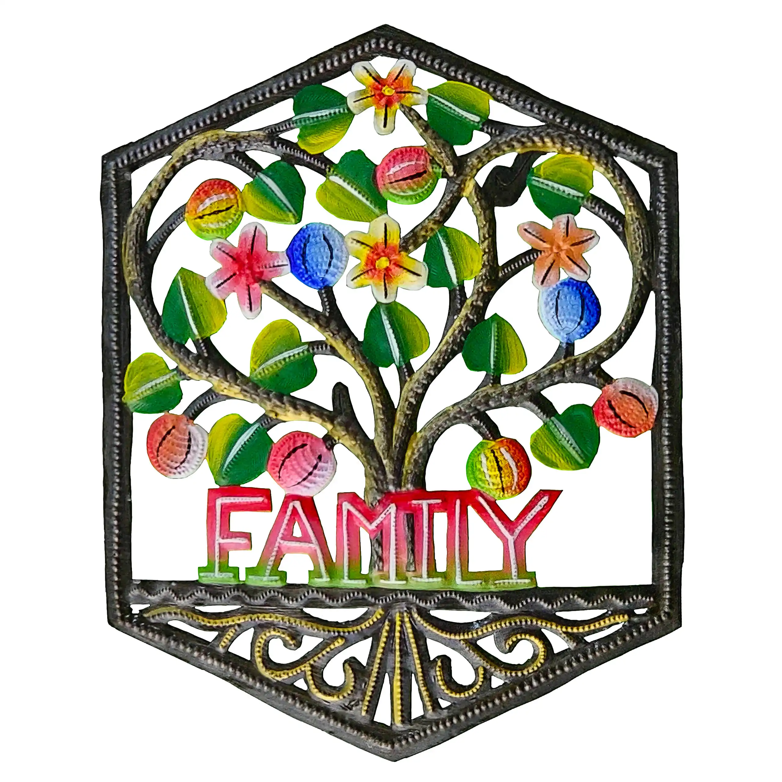Perfect for home or garden, each Painted Hexagonal Family is approximately 7.25″ x 9.25″ x 0.5″ and hand-chiseled out of recycled steel oil drums by Haitian artisans using techniques first developed by Georges Liautaud in the late 1950s when he chalked out his first design on a flattened steel oil drum and then cut it out by hand with a mallet and chisel. As each piece is handmade, their final dimensions and finish may vary slightly.