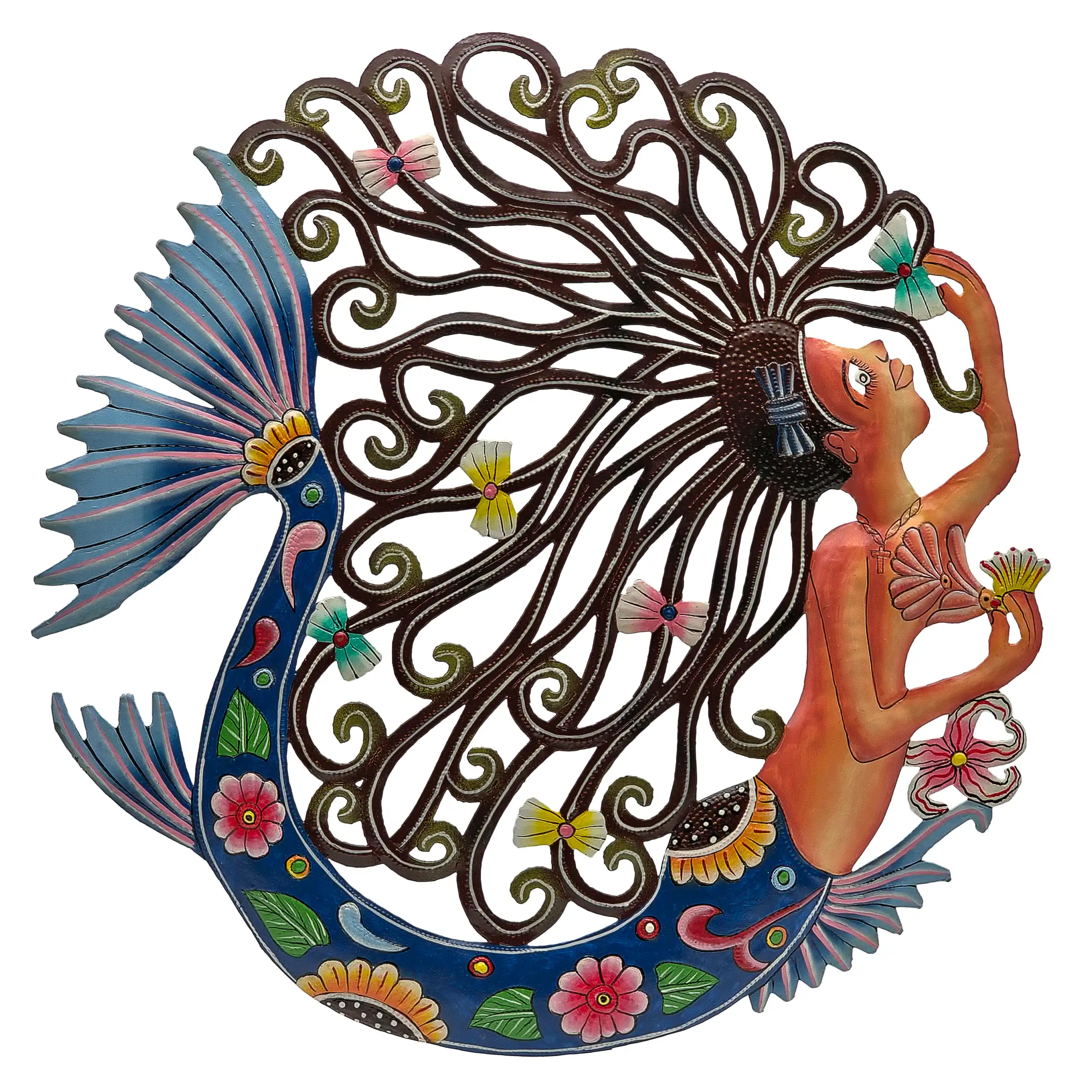 Perfect for home or garden, each Painted Mermaid Call is approximately 22.5″ x 22.5″ x 0.5″ and hand-chiseled out of recycled steel oil drums by Haitian artisans using techniques first developed by Georges Liautaud in the late 1950s when he chalked out his first design on a flattened steel oil drum and then cut it out by hand with a mallet and chisel. As each piece is handmade, their final dimensions and finish may vary slightly.
