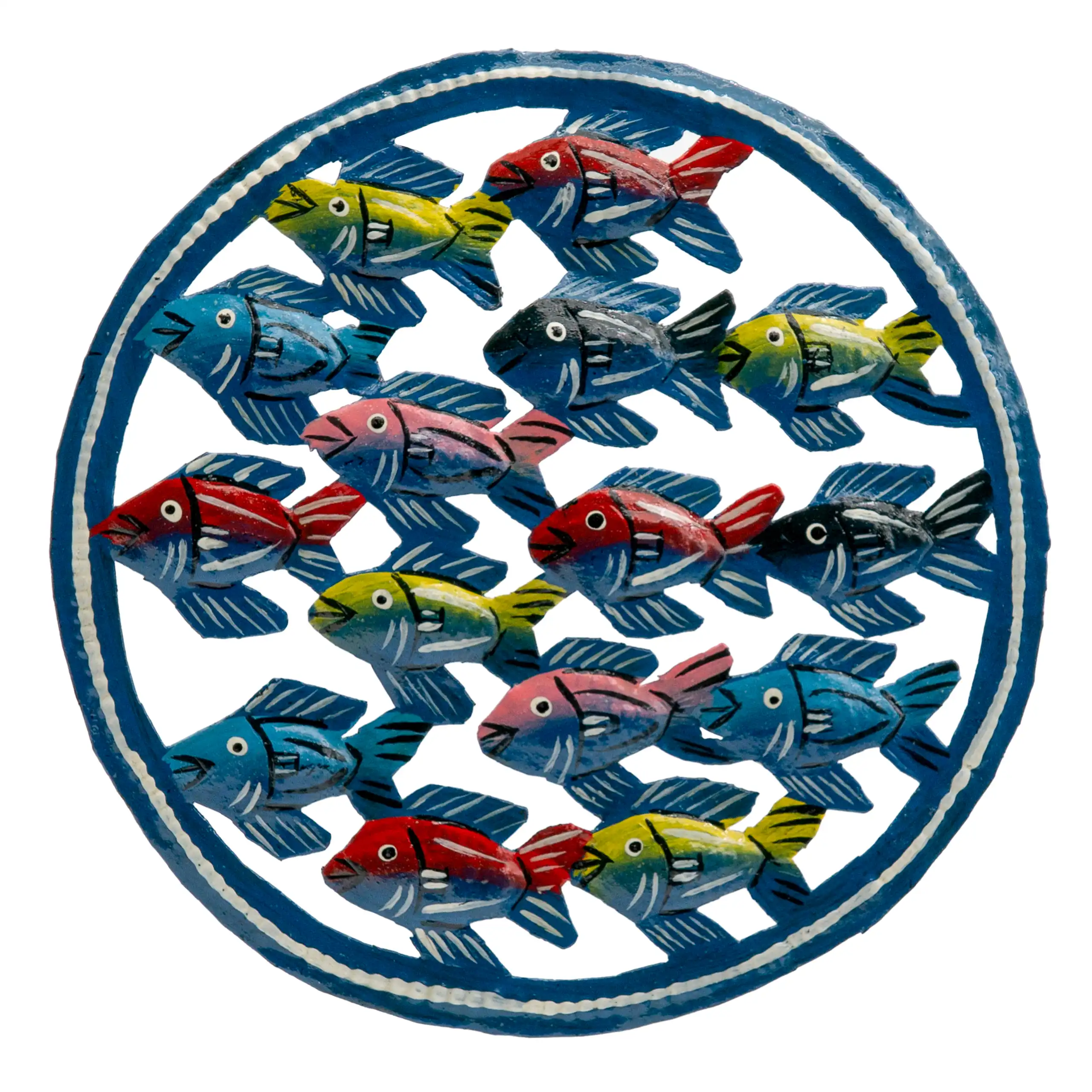 Perfect for home or garden, each Painted Mini School of Fish is approximately 7″ x 7″ x 0.5″ and hand-chiseled out of recycled steel oil drums by Haitian artisans using techniques first developed by Georges Liautaud in the late 1950s when he chalked out his first design on a flattened steel oil drum and then cut it out by hand with a mallet and chisel. As each piece is handmade, their final dimensions and finish may vary slightly.