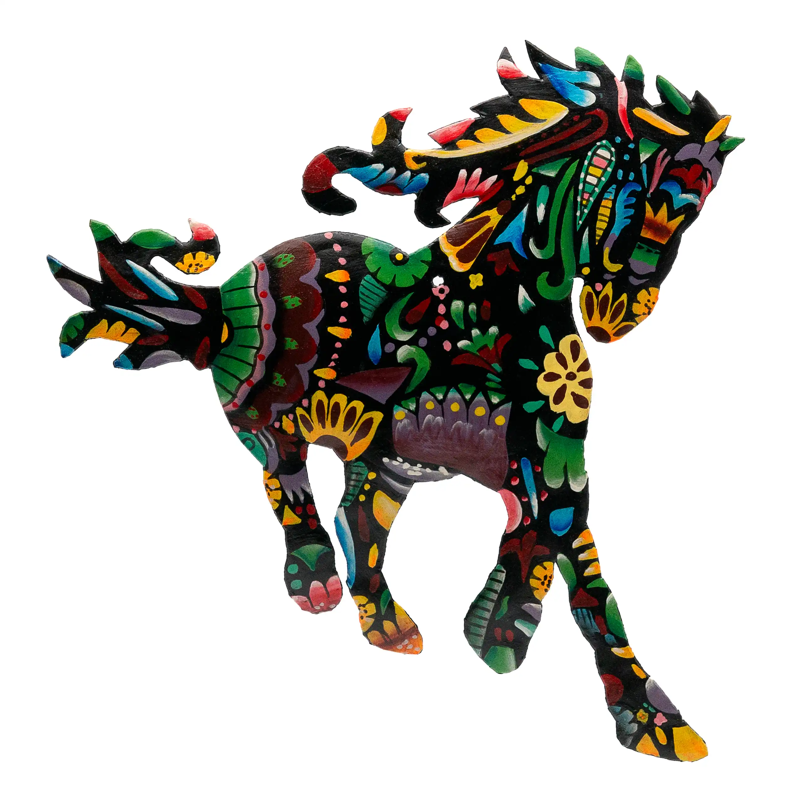 Perfect for home or garden, each Painted Small Galloping Horse is approximately 13″ x 10″ x 0.5″ and hand-chiseled out of recycled steel oil drums by Haitian artisans using techniques first developed by Georges Liautaud in the late 1950s when he chalked out his first design on a flattened steel oil drum and then cut it out by hand with a mallet and chisel. As each piece is handmade, their final dimensions and finish may vary slightly.