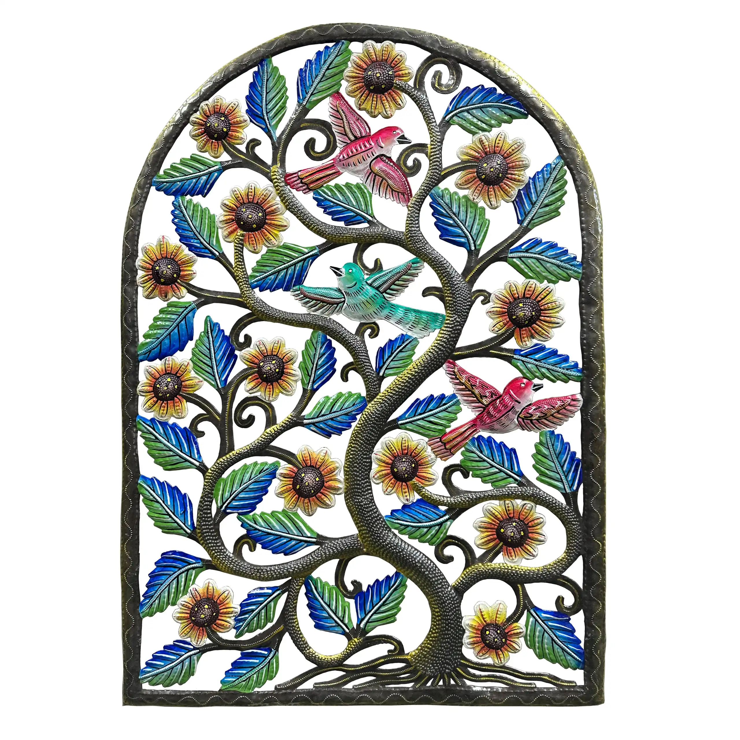 The 23″ x 33″ Painted Sunflower Tree with Birds Arch is hand-chiseled out of recycled steel oil drums by Haitian artisans.