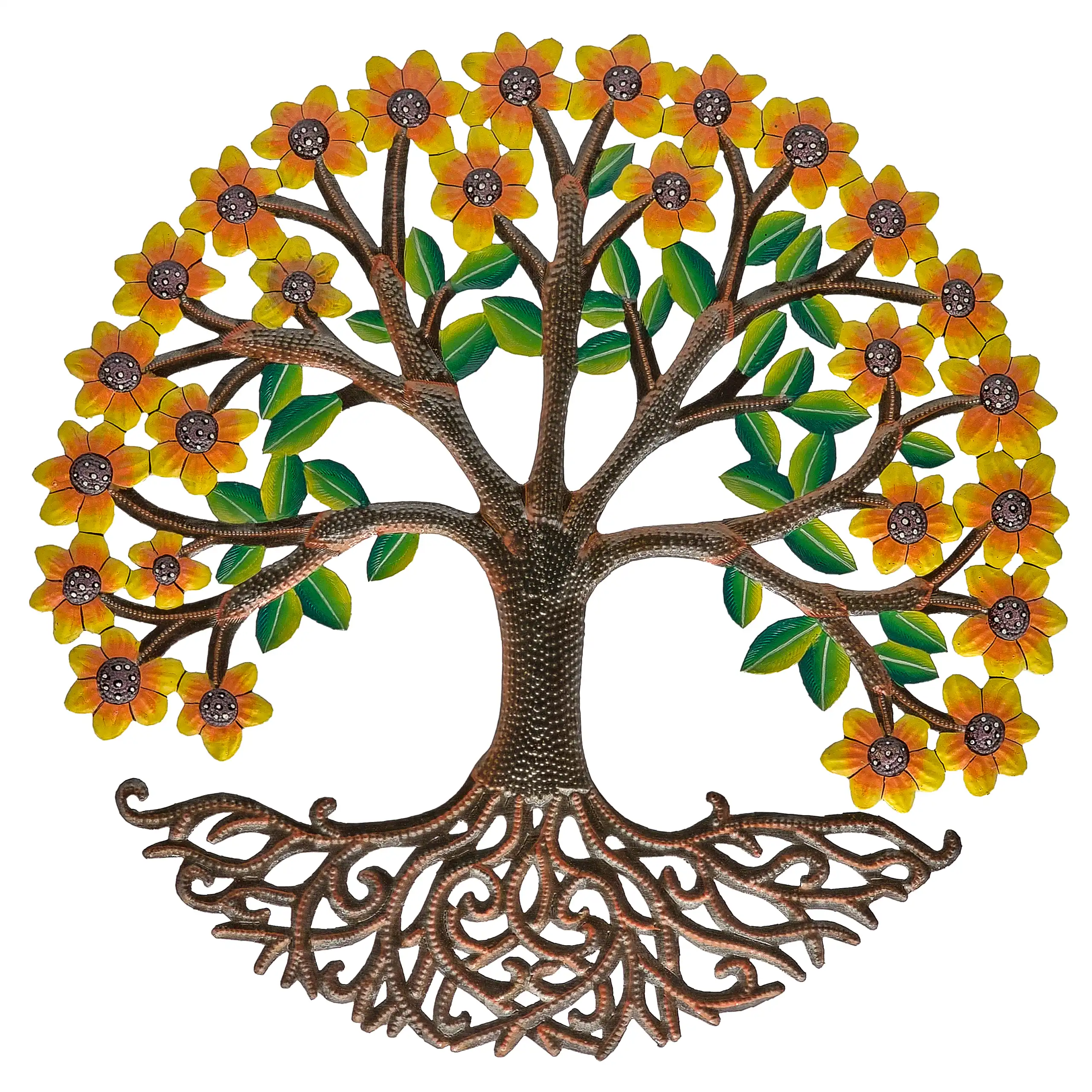 Perfect for home or garden, each Painted Yellow Blooms Tree is approximately 22.75″ x 22.75″ x 0.5″ and hand-chiseled out of recycled steel oil drums by Haitian artisans using techniques first developed by Georges Liautaud in the late 1950s when he chalked out his first design on a flattened steel oil drum and then cut it out by hand with a mallet and chisel. As each piece is handmade, their final dimensions and finish may vary slightly.