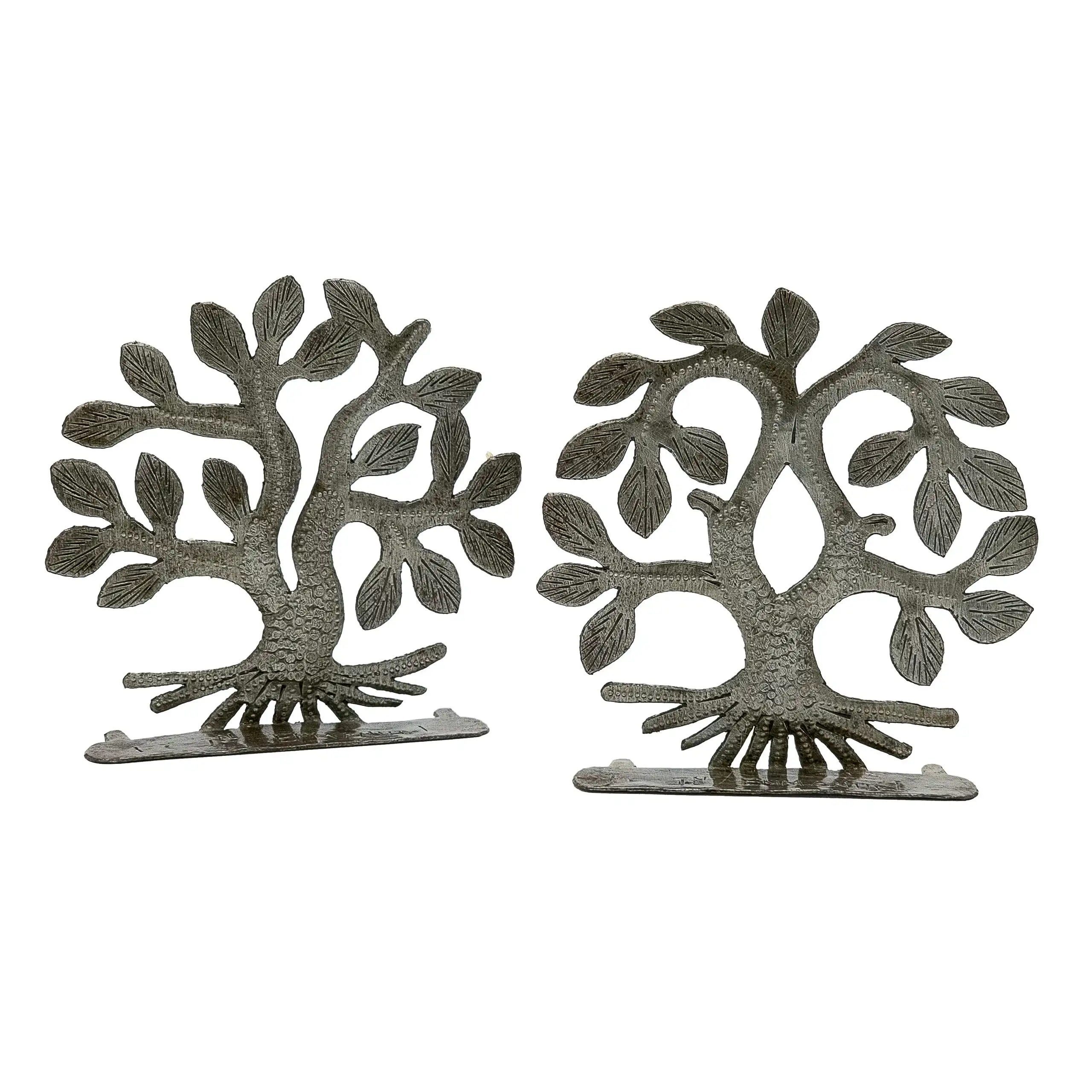 The 4.5″ Pair of Freestanding Trees is hand-chiseled out of recycled steel oil drums by Haitian artisans.