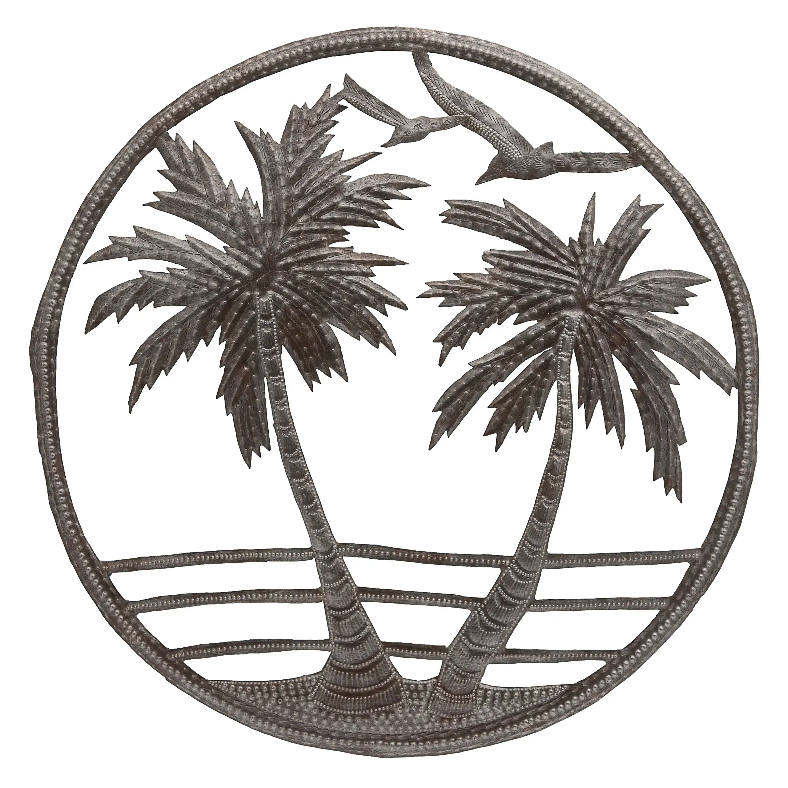 Perfect for home or garden, each Palms at the Beach is approximately 16.5″ x 16.5″ x 0.5″ and hand-chiseled out of recycled steel oil drums by Haitian artisans using techniques first developed by Georges Liautaud in the late 1950s when he chalked out his first design on a flattened steel oil drum and then cut it out by hand with a mallet and chisel. As each piece is handmade, their final dimensions and finish may vary slightly.