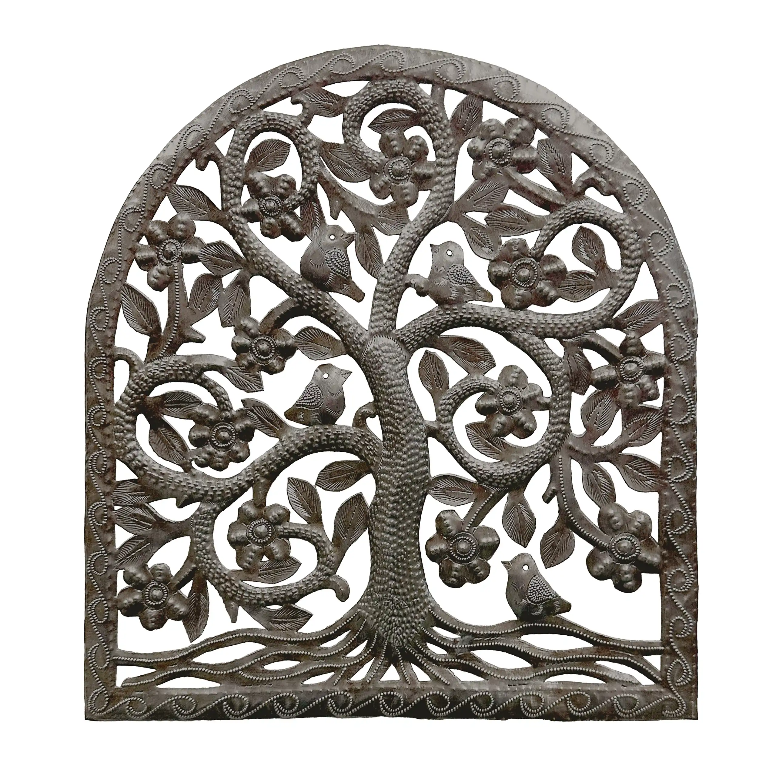 Perfect for home or garden, each Petals and Perch Arch is approximately 12.5″ x 13″ x 0.5″ and hand-chiseled out of recycled steel oil drums by Haitian artisans using techniques first developed by Georges Liautaud in the late 1950s when he chalked out his first design on a flattened steel oil drum and then cut it out by hand with a mallet and chisel. As each piece is handmade, their final dimensions and finish may vary slightly.