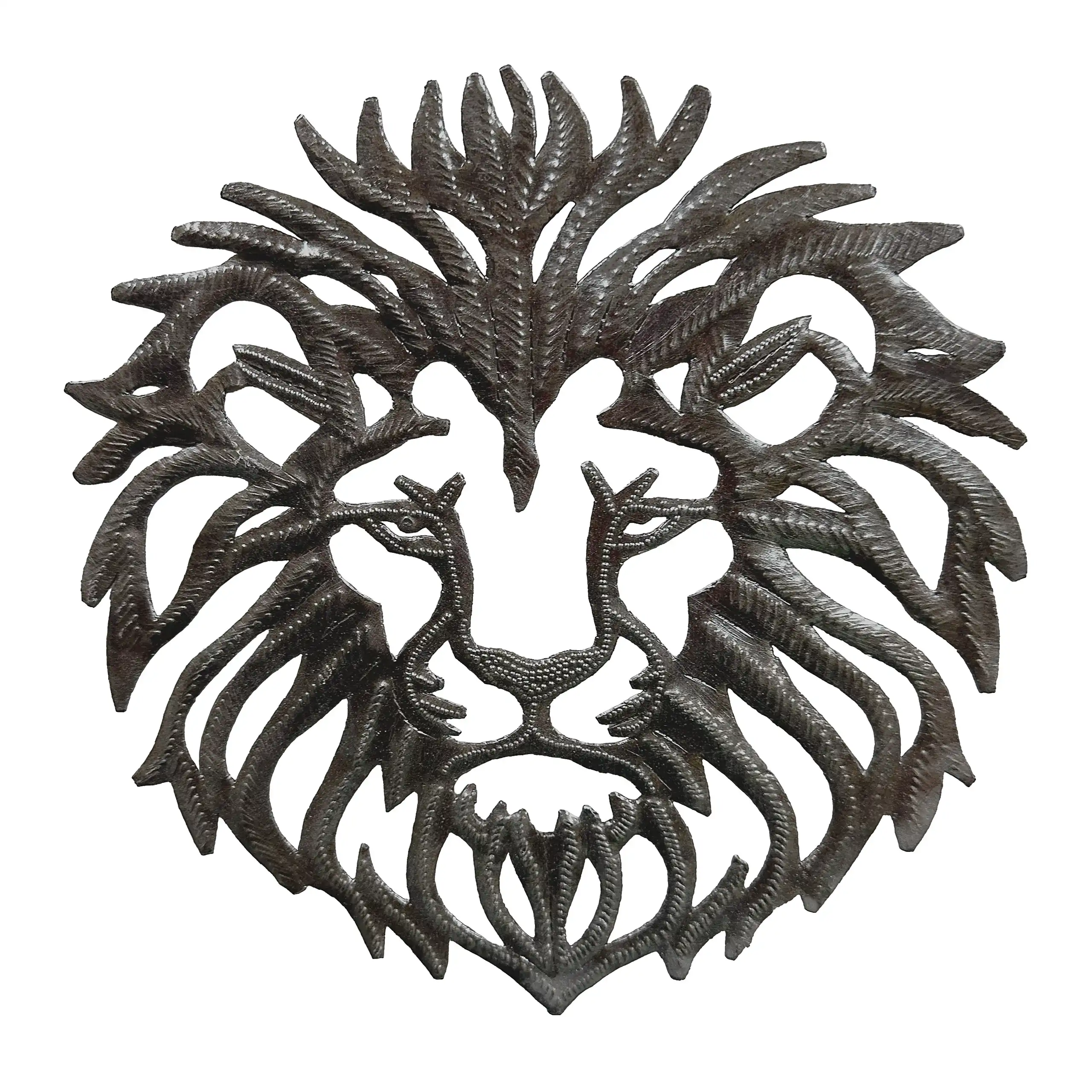 Perfect for home or garden, each Small Lionwork is approximately 10″ x 10″ x 0.5″ and hand-chiseled out of recycled steel oil drums by Haitian artisans using techniques first developed by Georges Liautaud in the late 1950s when he chalked out his first design on a flattened steel oil drum and then cut it out by hand with a mallet and chisel. As each piece is handmade, their final dimensions and finish may vary slightly.